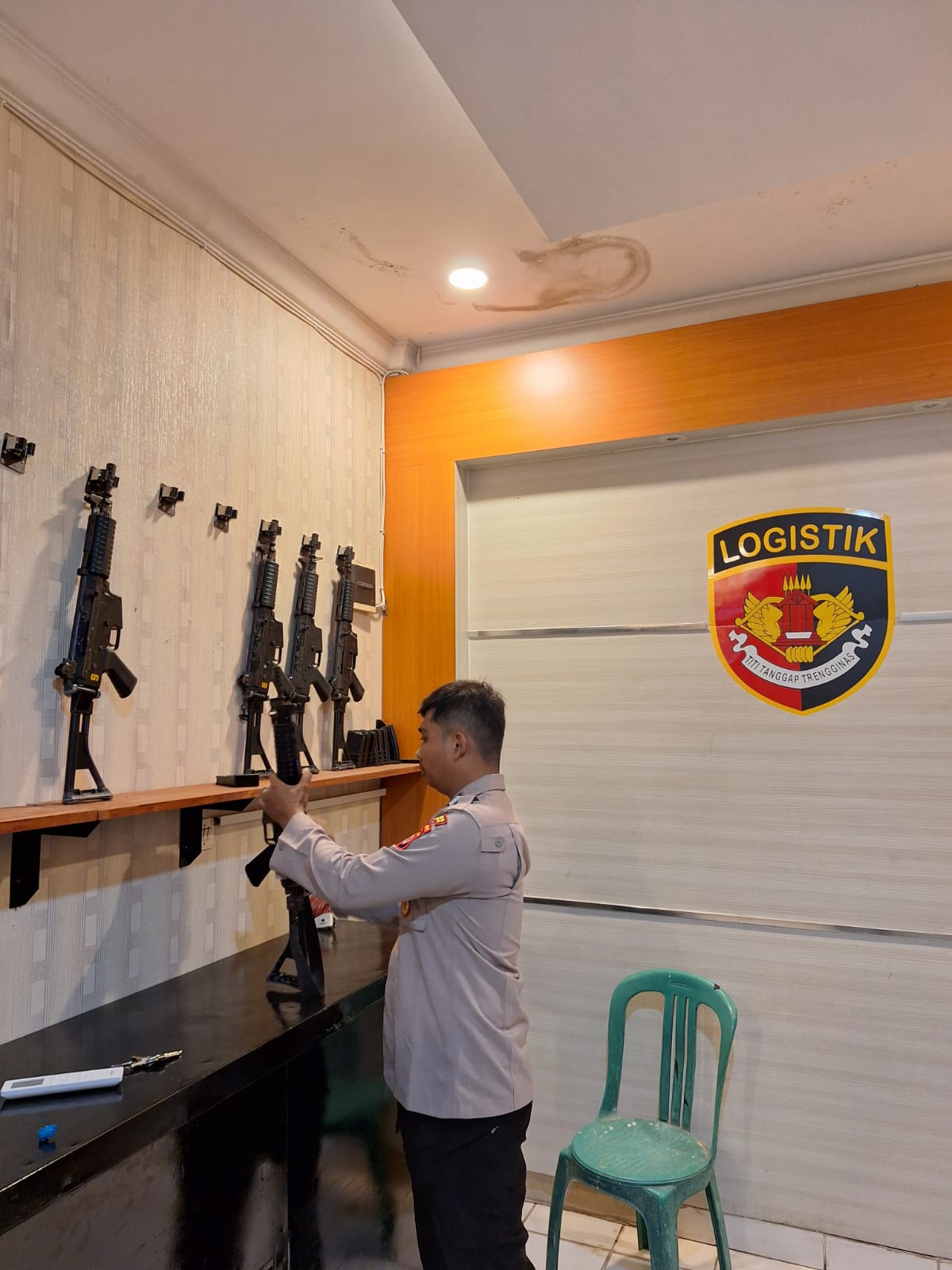 Cilegon,Polres Cilegon Polda Banten Personel Baglog Melaksanakan pengecekan dan membersihkan senjata Api Dinas yang ada Digudang Logistik Polres Cilegon,