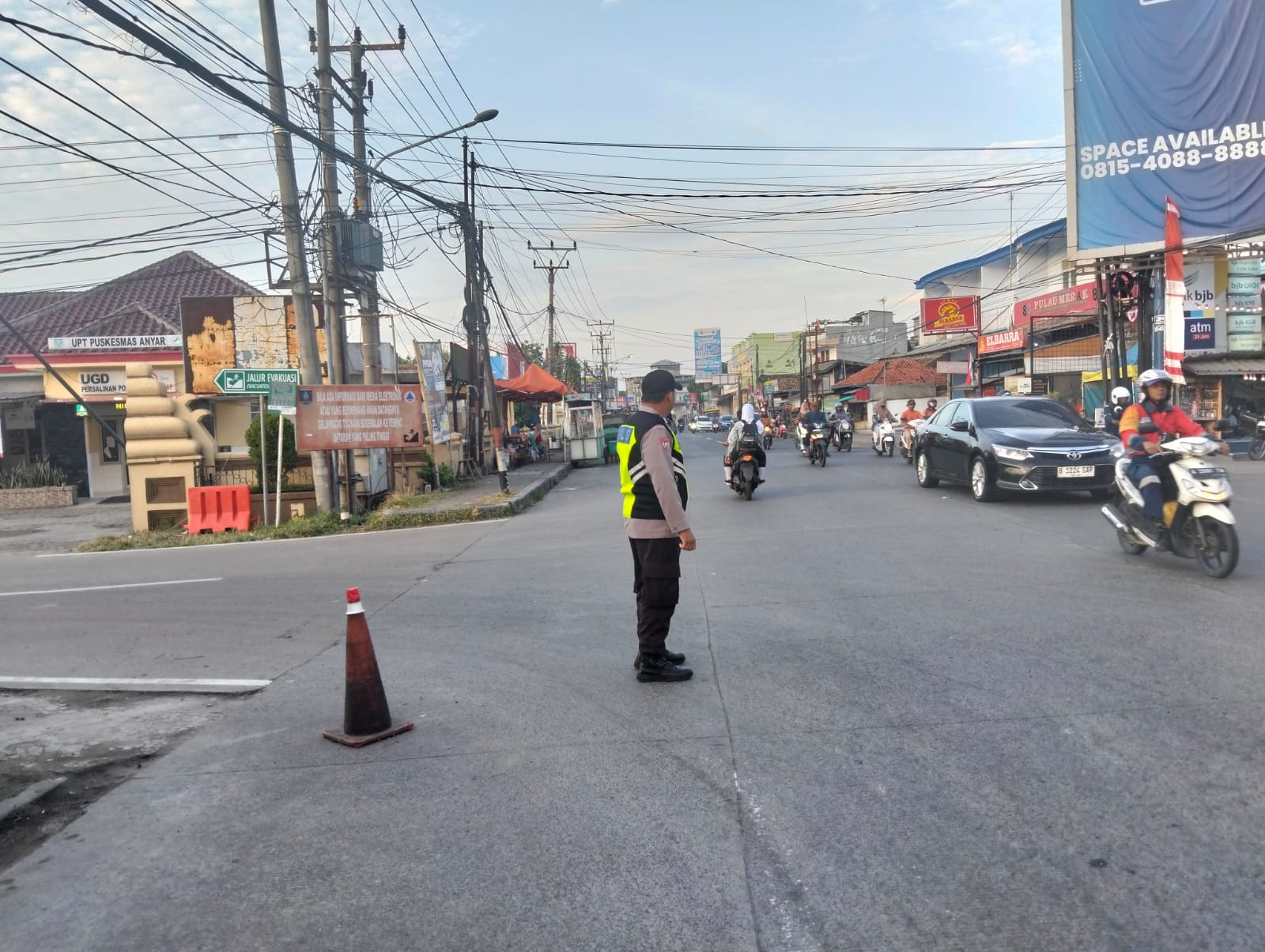 Kapolres Cilegon Polda Banten AKBP Dr. Martua Raja Taripar Laut Silitonga Melalui Kapolsek Anyar Polres Cilegon Polda Banten IPTU Iwan Sofiyan Mengatakan Dalam Pelayanan Masyarakat demi Kelancaran Arus Lalu-lintas di pagi hari Anggota Polsek Anyar tetap melakukan kegiatan Pengaturan arus lalu-lintas yang rutin dilaksanakan guna mencegah Kemacetan arus lalu-lintas yang meningkat khusus nya pada pagi hari di Simpang Puskesmas, simpang Gudang Areng Jl. Raya Anyar-Cinangka.