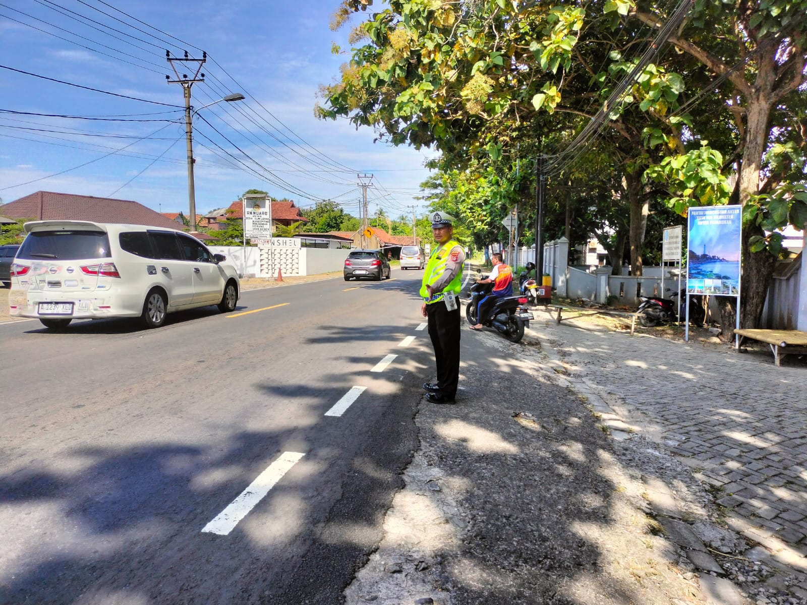 Personil Polsek Cilegon Polres Cilegon melakukan Pengaturan arus lalin Polsek Cilegon lancarkan arus kendara.