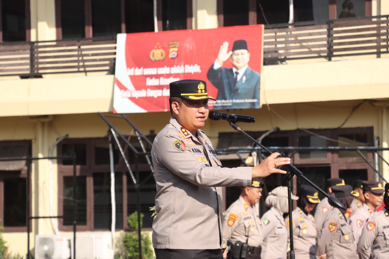 Apel dipimpin langsung oleh Kapolres Cilegon, AKBP Dr. Martua Raja Taripar Laut Silitonga, S.H., S.I.K., M.Si., dengan dihadiri oleh Wakapolres, para Kabag, Kasat, Kasi, serta personel dari seluruh fungsi yang tergabung dalam pasukan siaga.
