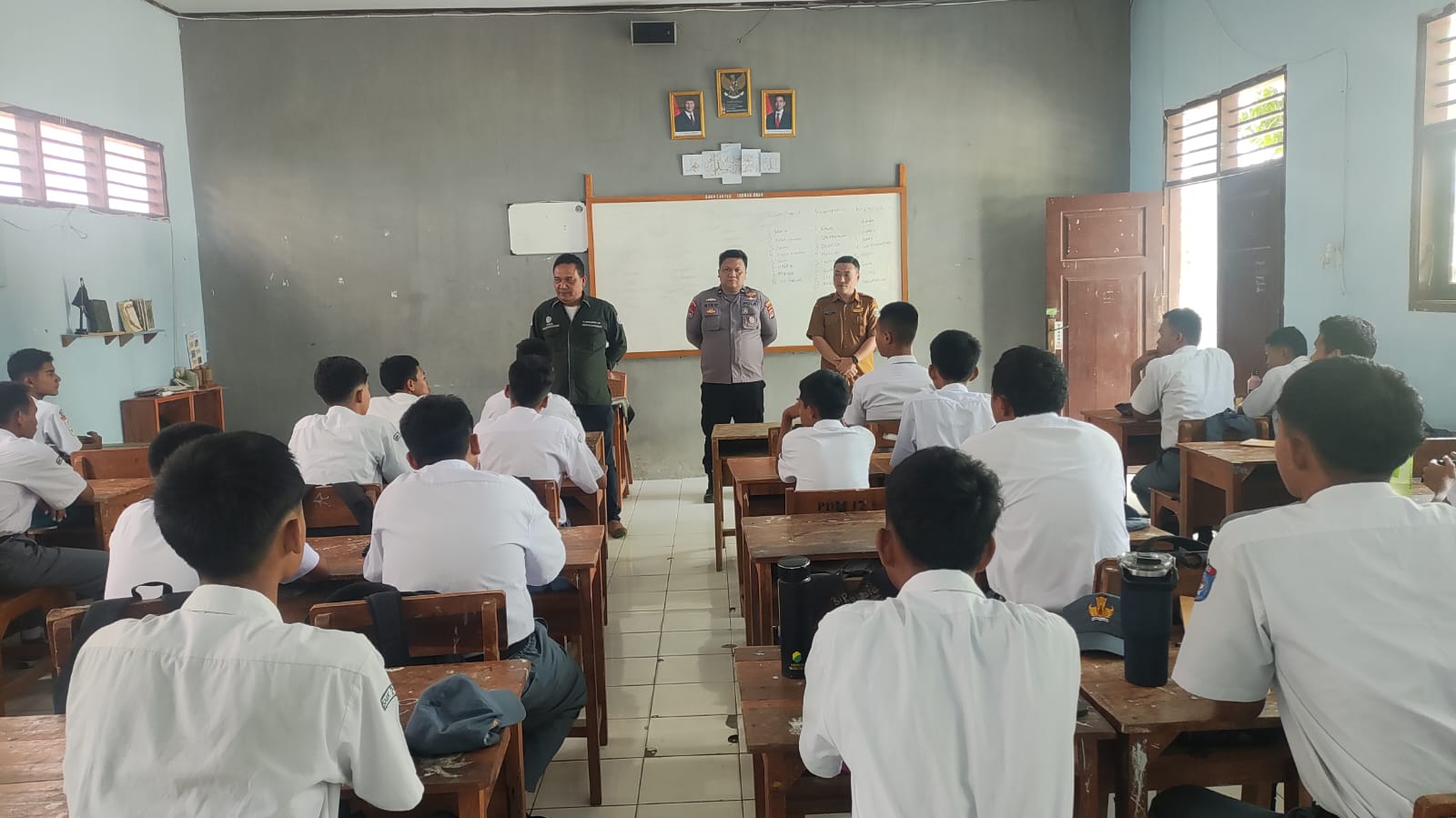 Kapolres Cilegon Polda Banten AKBP Dr. Martua Raja Taripar Laut Silitonga Melalui Kapolsek Anyar Polres Cilegon Polda Banten IPTU Iwan Sofiyan melaksanakan Sosialisasi dan Penyuluhan sosialisasi tentang Minuman Keras dan Bahaya Obat-Obatan Terlarang (Narkotika) dan kenakalan remaja kepada Siswa SMKN 1 Anyar Desa Grogol Indah Kec. Anyar