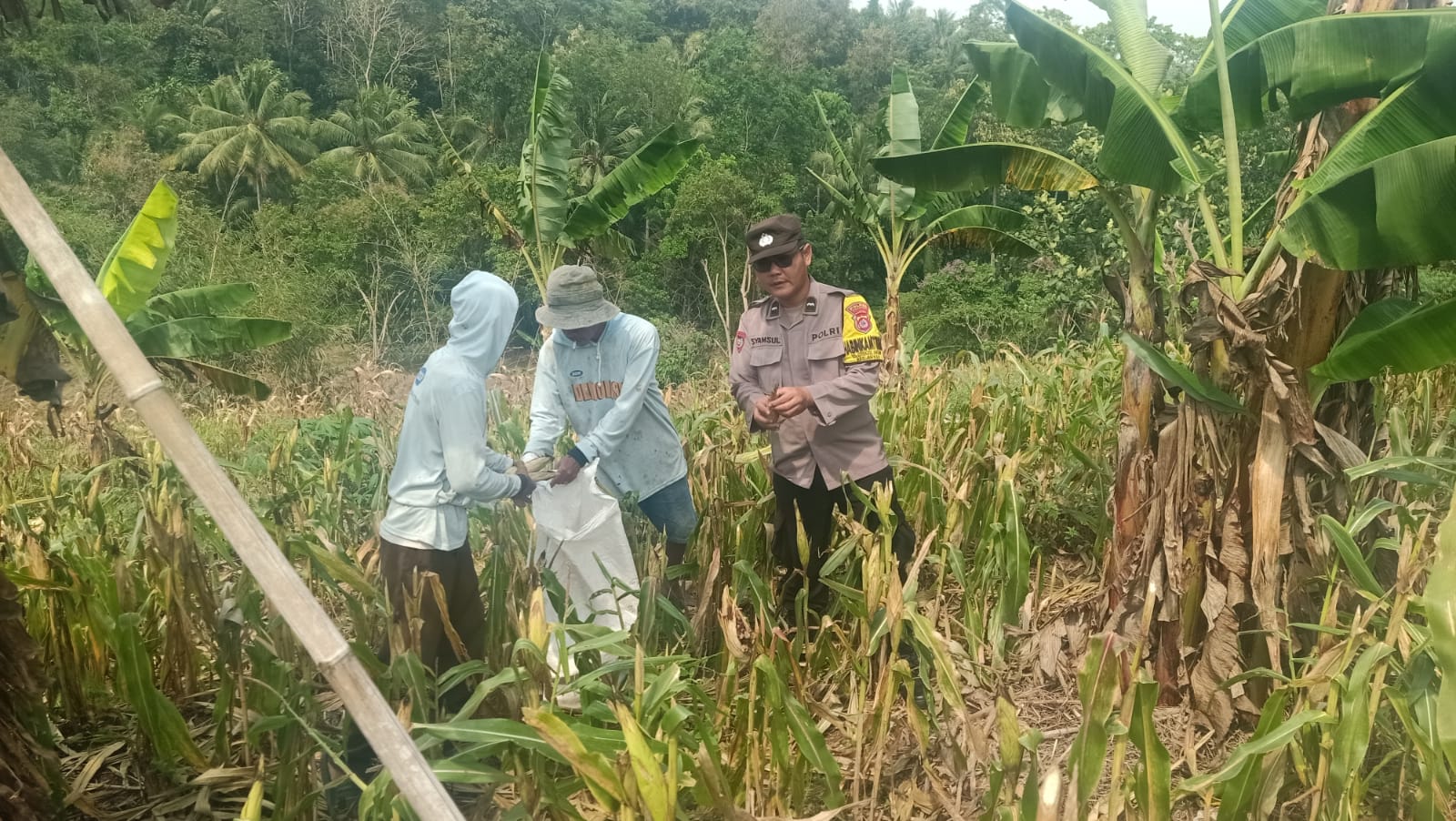 Cilegon ~ Dalam rangka mendukung ketahanan pangan dan meningkatkan produktivitas pertanian di wilayah kec. Anyar Polsek Anyar Polres Cilegon Polda Banten Monitoring Panen Lahan Kebun Jagung kelompok Tani. Selasa (02/09)