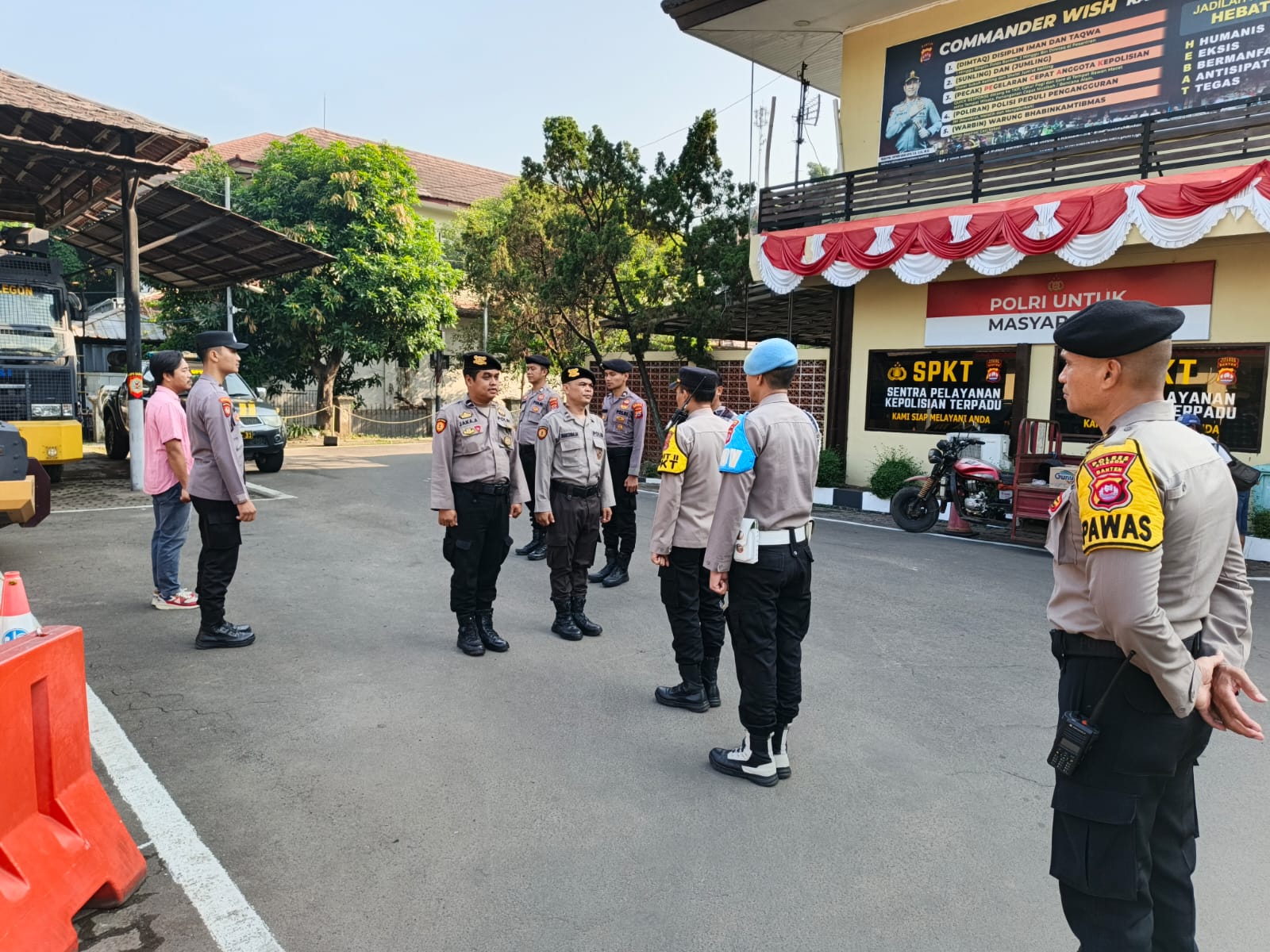 Cilegon, personel Satreskrim Polres Cilegon Polda Banten melaksanakan piket di penjagaan pintu masuk Polres Cilegon Polda Banten untuk memastikan mako Polres Cilegon dalam keadaan aman dan nyaman dalam melayani Masyarakat. Senin (08/09/2025).