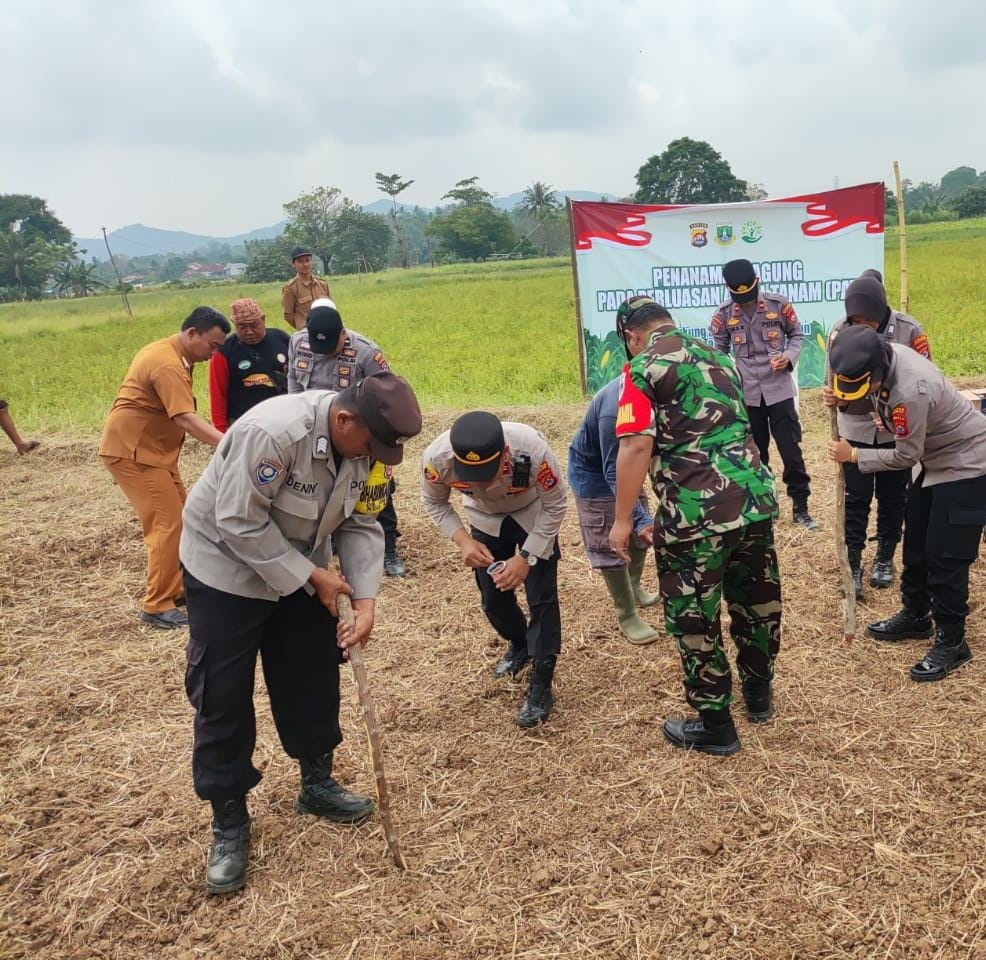 Kapolres Cilegon AKBP AKBP Dr. Martua Raja Taripar Laut Silitonga Melalui Kapolsek Anyar Polres Cilegon IPTU Iwan Sofiyan, S.E.,M.M Kp Meijing Desa Mekarsari Kecamatan Anyar Kab Serang Dilaksanakan dan mengikuti Kegiatan Penanaman Jagung yang dilaksanakan Oleh Poktam Karya Tani Desa Mekarsari Pada perluasan Area Tana. dalam Rangka Mendukung Swasembada Pangan 2025 Serta Implementasi Program Prioritas Asta Cinta Presiden Republik Indonesia