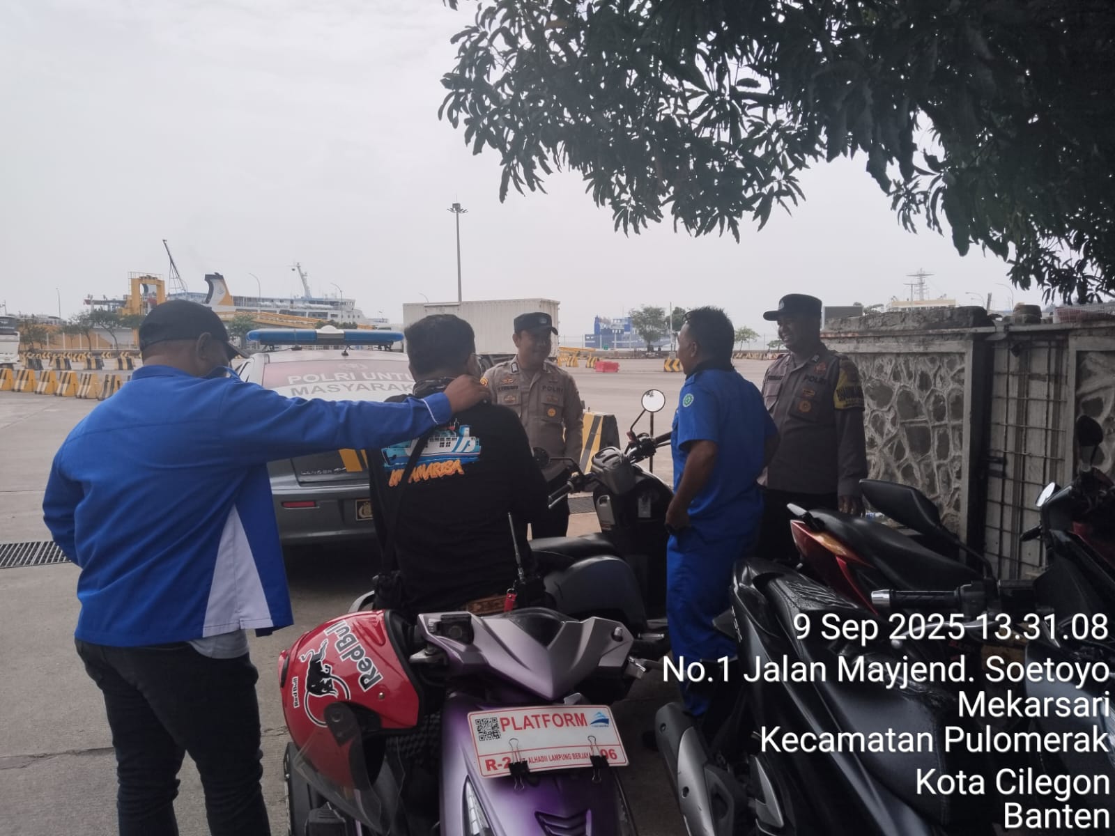 Cilegon - Personel Polsek Kskp Merak Polres Cilegon Polda Banten melaksanakan sambang dan patroli kawasan pelabuhan merak dalam rangka menjaga Harkamtibmas di Kawasan Pelabuhan Merak, Selasa (09/08/2025).