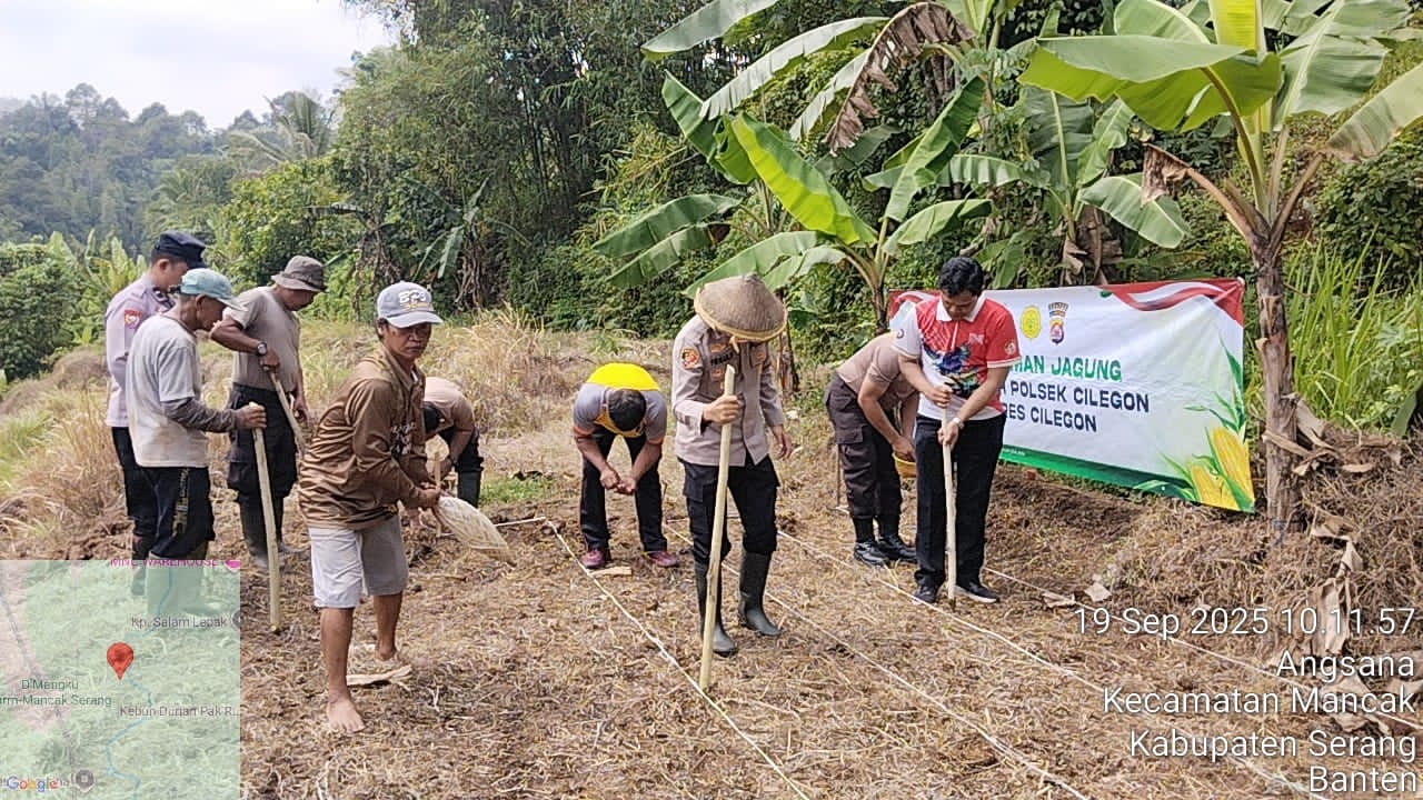 Dilaksanakan Penanaman lahan baru untuk Bibit Jagung Hybrida yang bertempat di lahan jagung milik kelompok tani Bpk. Misra Rt. 04/ Rw.01 Kp. Gunung Ranji Kelurahan Angsana Kecamatan Mancak Kab. Serang Wilkum Polres Cilegon.