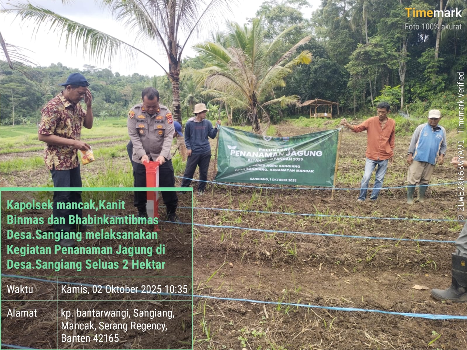 Mancak - Sebagai Pengemban Fungsi Harkamtibmas, Bhabinkamtibmas Polsek Mancak Polres Cilegon Laksanakan Sambang dan Monitoring Penanaman Jagung Hibrida Desa Sangiang Kecamatan Mancak Kab Serang. Kamis (02/10/2025).