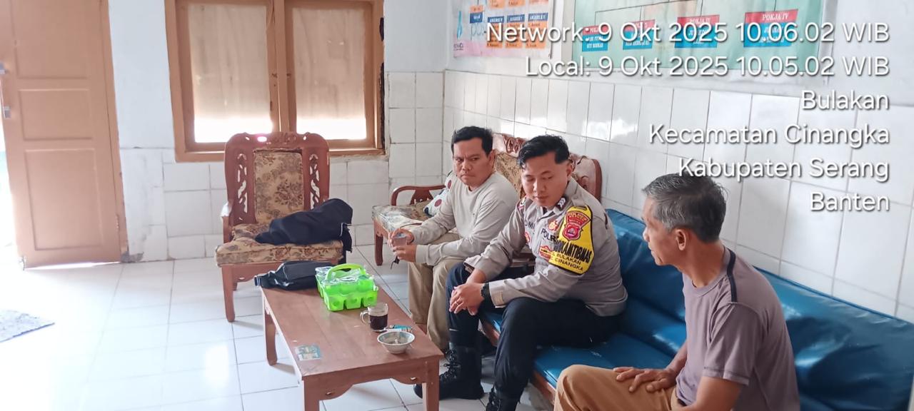 *CILEGON* dalam Rangka Mengantisipasi Gktm di wilayah Personil Bhabinkamtibmas Cinangka melakukan patroli Dialogis dengan Kepala Desa dan warga dan Menanyakan situasi Kamtibmas di wilayah dalam Rangka Menjaga Harkamtibmas di Desa Binaannya Kecamatan Cinangka Kab. Serang. Kamis (09/10/2025).