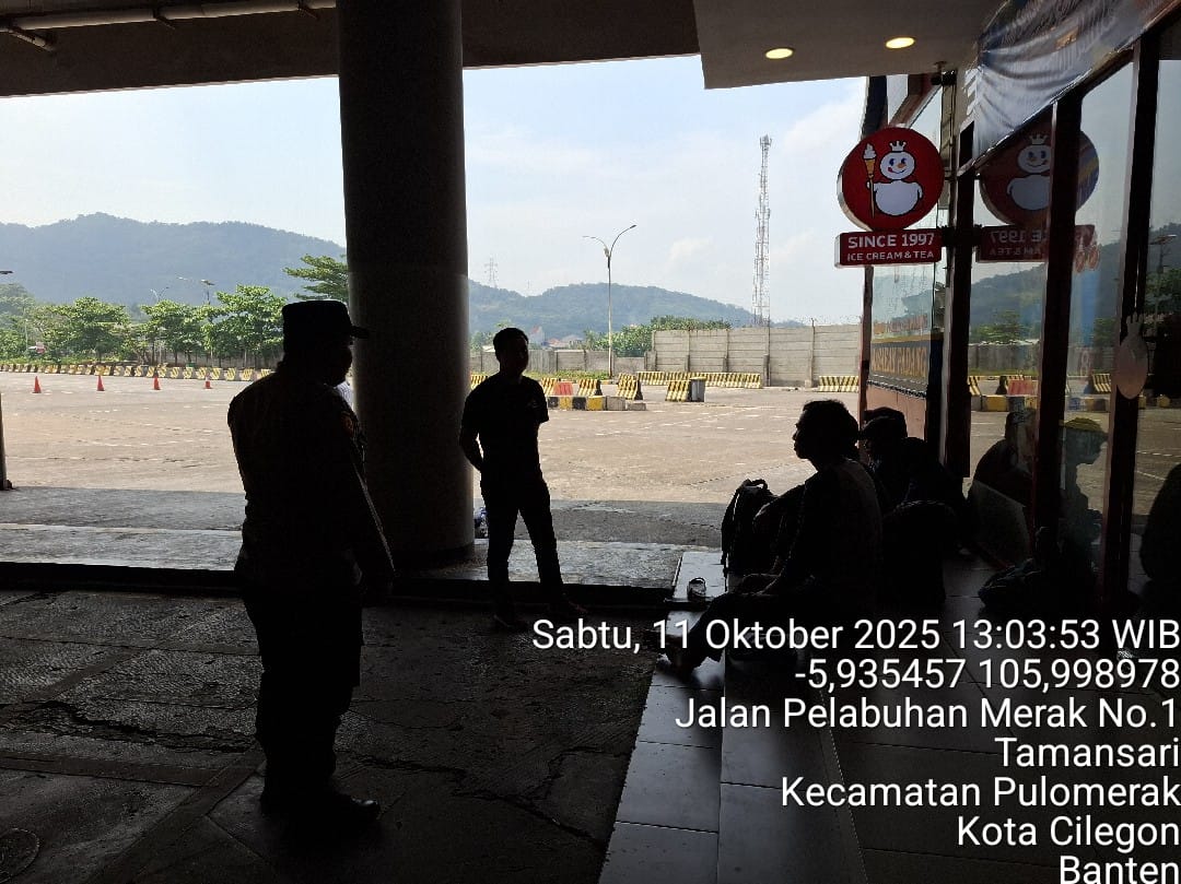 Cilegon - Personel Polsek Kskp Merak Polres Cilegon Polda Banten melaksanakan sambang dan patroli kawasan pelabuhan merak dalam rangka menjaga Harkamtibmas di Kawasan Pelabuhan Merak, Sabtu (11/10/2025).