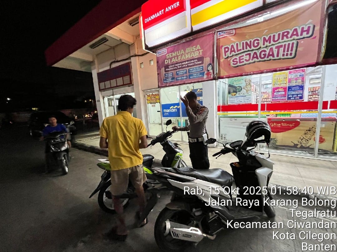 Cilegon - Personil Polsek Ciwandan Polres Cilegon Polda Banten melaksanakan patroli malam untuk mengantisipasi potensi kejahatan, khususnya pembobolan minimarket, di daerah hukum Polsek Ciwandan. Kegiatan ini bertujuan untuk meningkatkan keamanan dan memberikan rasa aman kepada masyarakat, Rabu (15/10/2025).