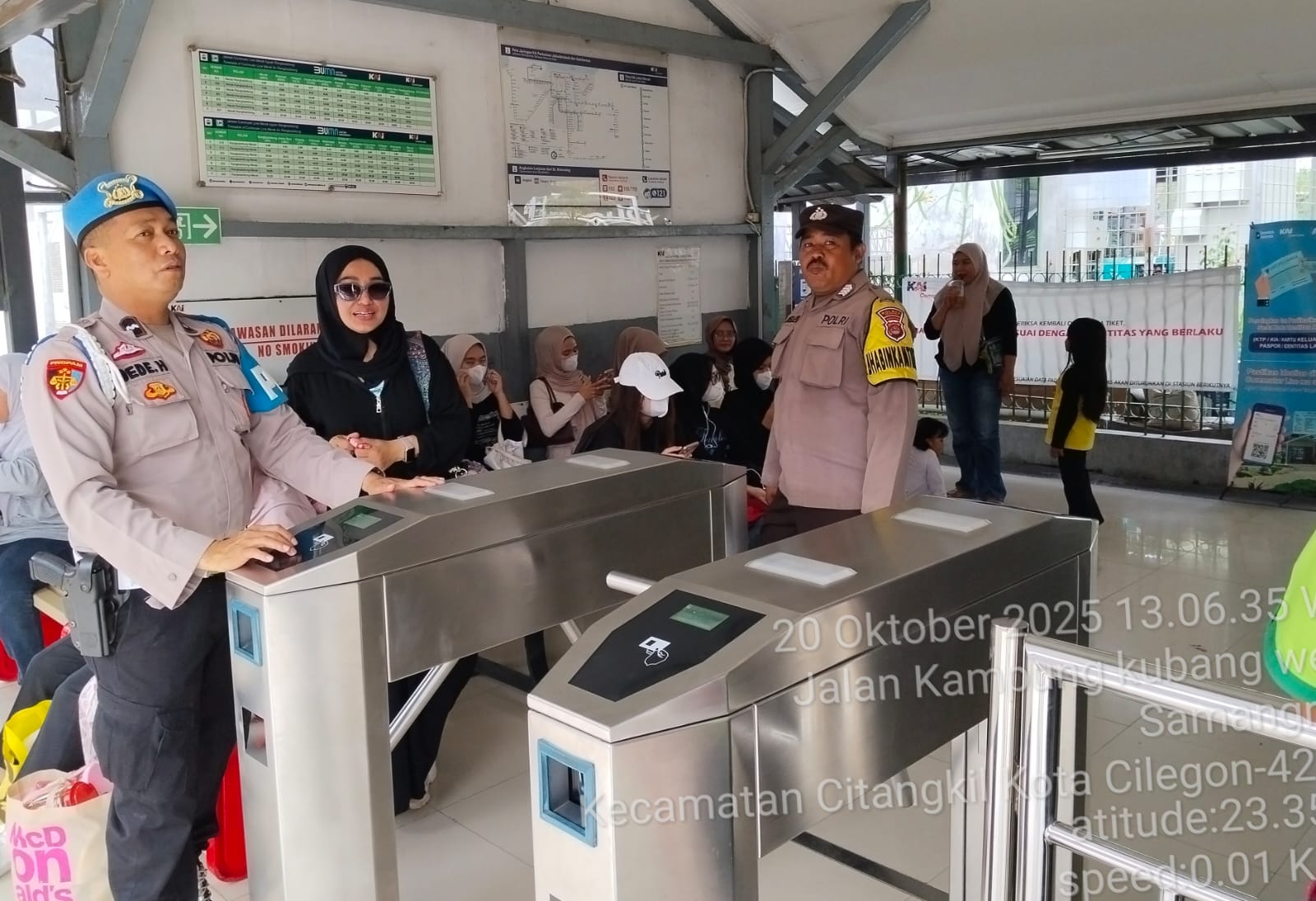 Cilegon - Personil Polsek Ciwandan Polres Cilegon Polda Banten melaksanakan giat patroli Dan dengan sambangi Petugas Stasiun Kereta Api dan penjaga pintu perlintasan kereta api, Senin (20/10/2025).