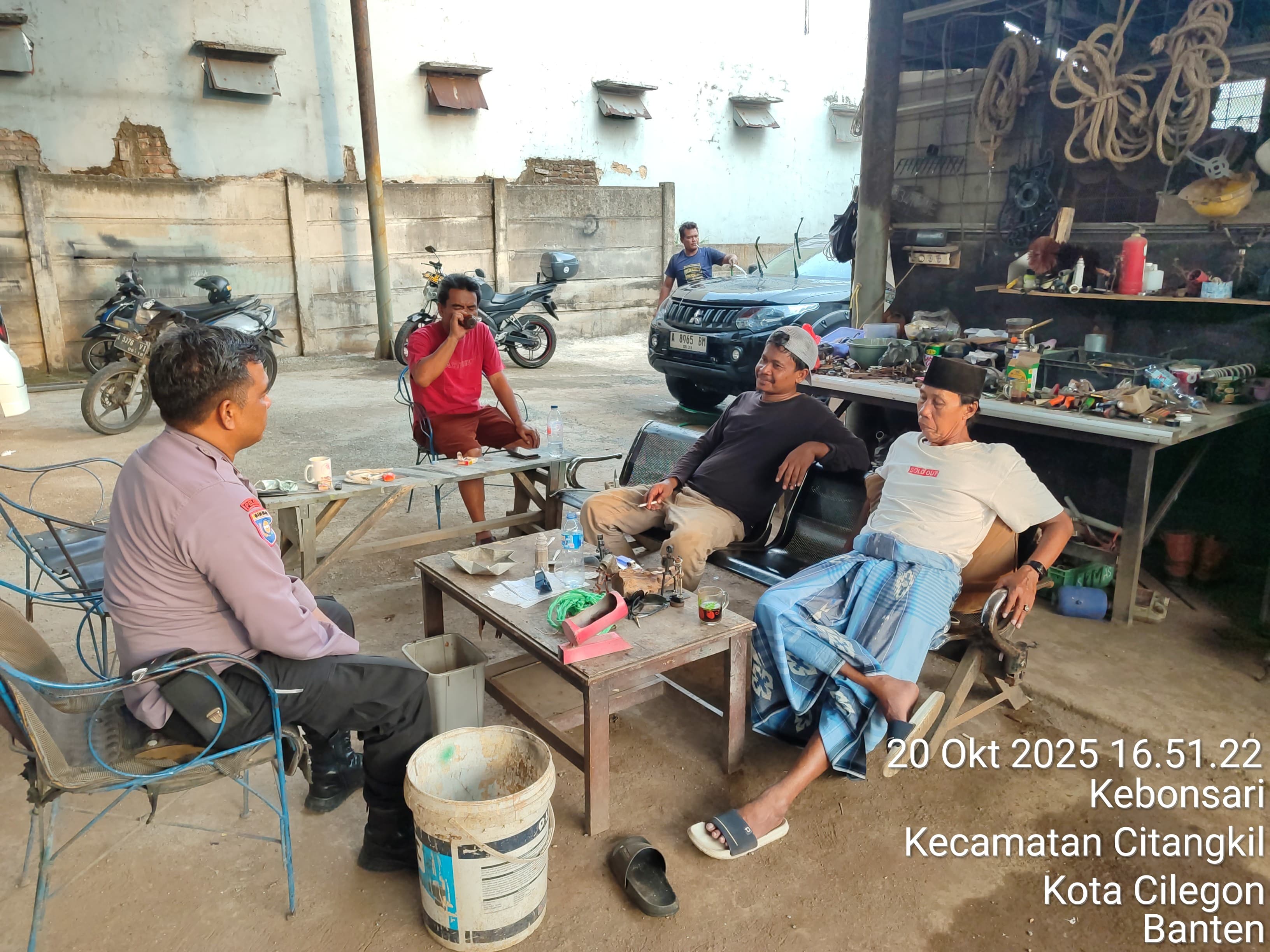Cilegon – Bhabinkamtibmas Polsek Ciwandan Selalu Hadir Di Setiap Kegiatan warga binaanya merupakan salah satu tugas rutin Bhabinkamtibmas, yakni dengan melaksanakan kunjungan kepada masyarakat binaannya untuk menjalin silaturahmi yang lebih erat dan menyampaikan pesan-pesan kamtibmas serta mencari informasi yang berkembang di masyarakat agar tercipta situasi kamtibmas yang aman dan kondusif, Senin (20/10/2025).
