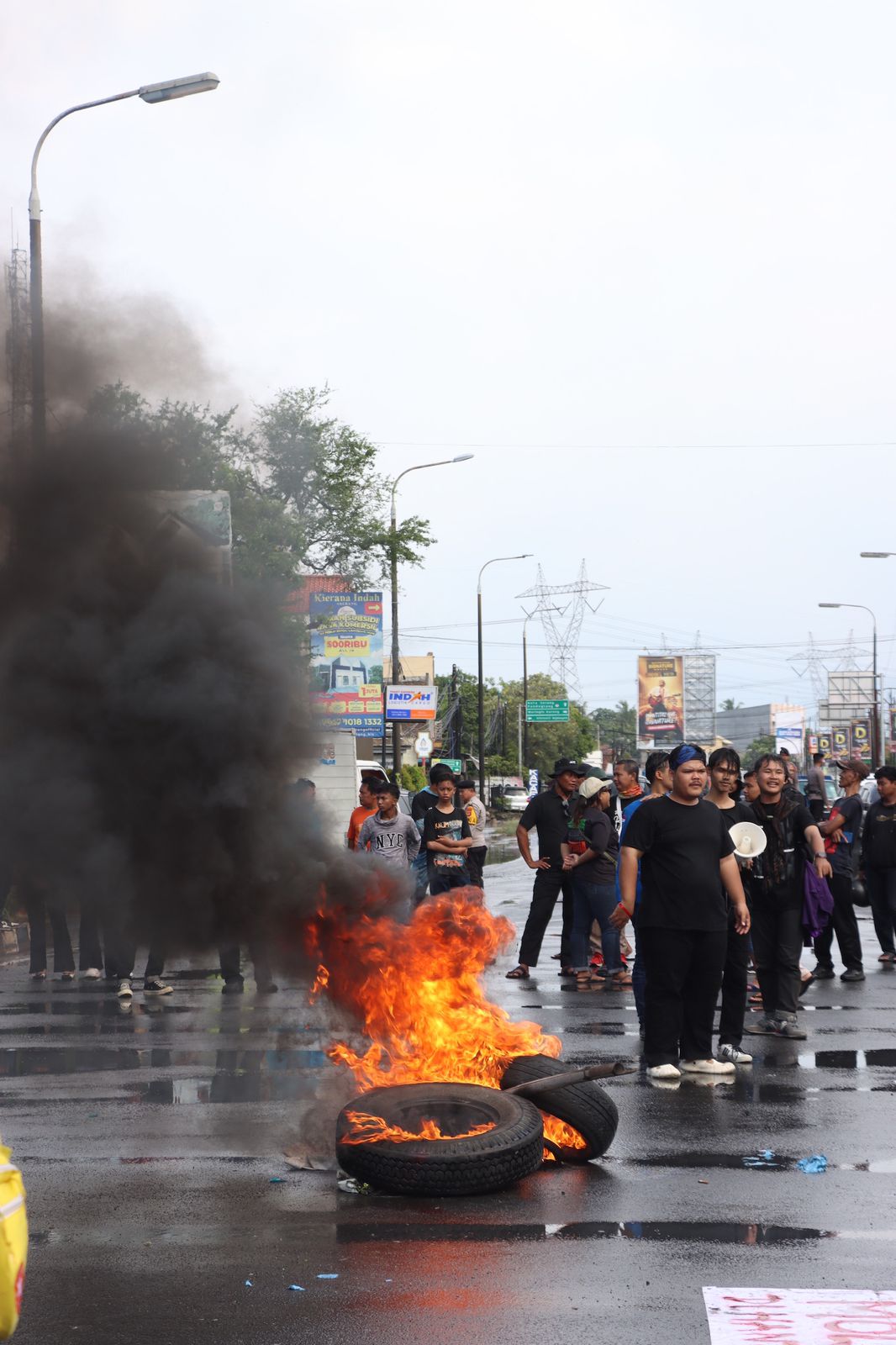 Pada pukul 14.30 WIB, massa melakukan pembakaran ban di simpang jalan sebagai bentuk ekspresi aksi. Menyikapi situasi tersebut, personel Polres Cilegon tetap mengedepankan pendekatan persuasif dan humanis agar situasi tetap terkendali.