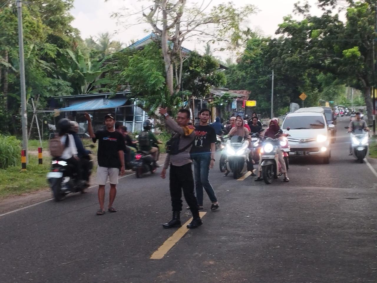 Personil Polsek Cinangka Polres Cilegon Polda Banten melakukan pengaturan dengan menggunakan jalur alternatif secara bergantian guna mengantisipasi antrian kendaraan di Jalan Raya Cinangka.