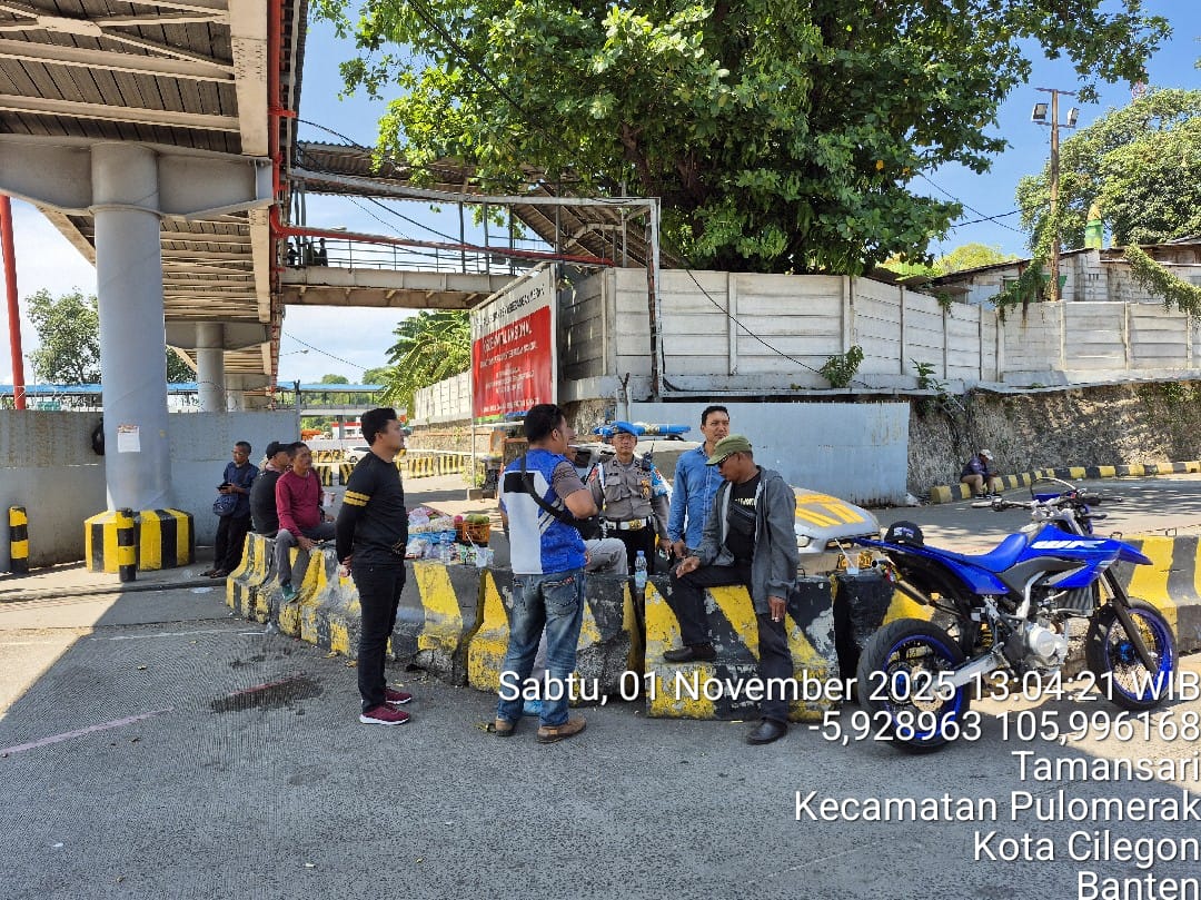 Cilegon - Personel Polsek Kskp Merak Polres Cilegon Polda Banten melaksanakan sambang dan patroli kawasan pelabuhan merak dalam rangka menjaga Harkamtibmas di Kawasan Pelabuhan Merak, Sabtu (01/11/2025).