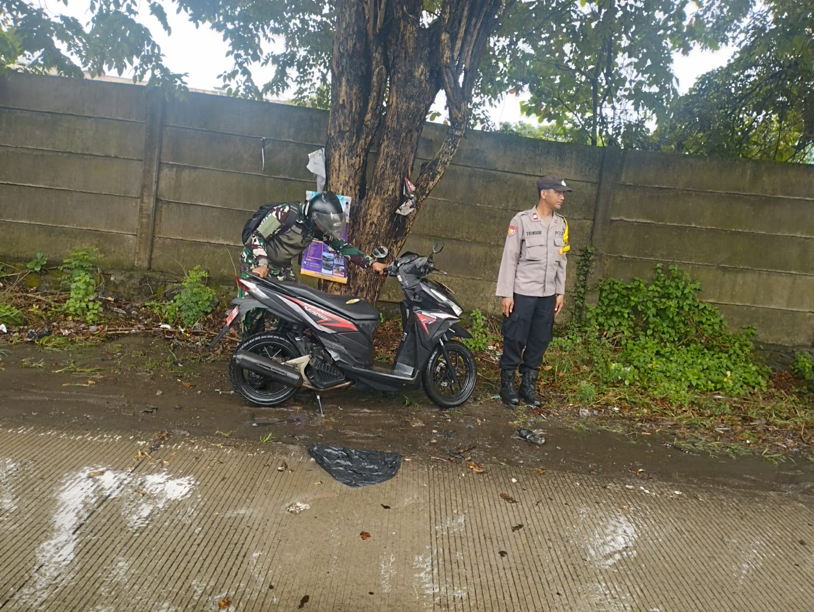 Personel Polsek Ciwandan masih melakukan pengaturan arus lalu lintas, dan situasi masih dalam keadaan aman terkendali. Masyarakat diimbau untuk berhati-hati saat melintas di area tersebut dan mengikuti arahan petugas.