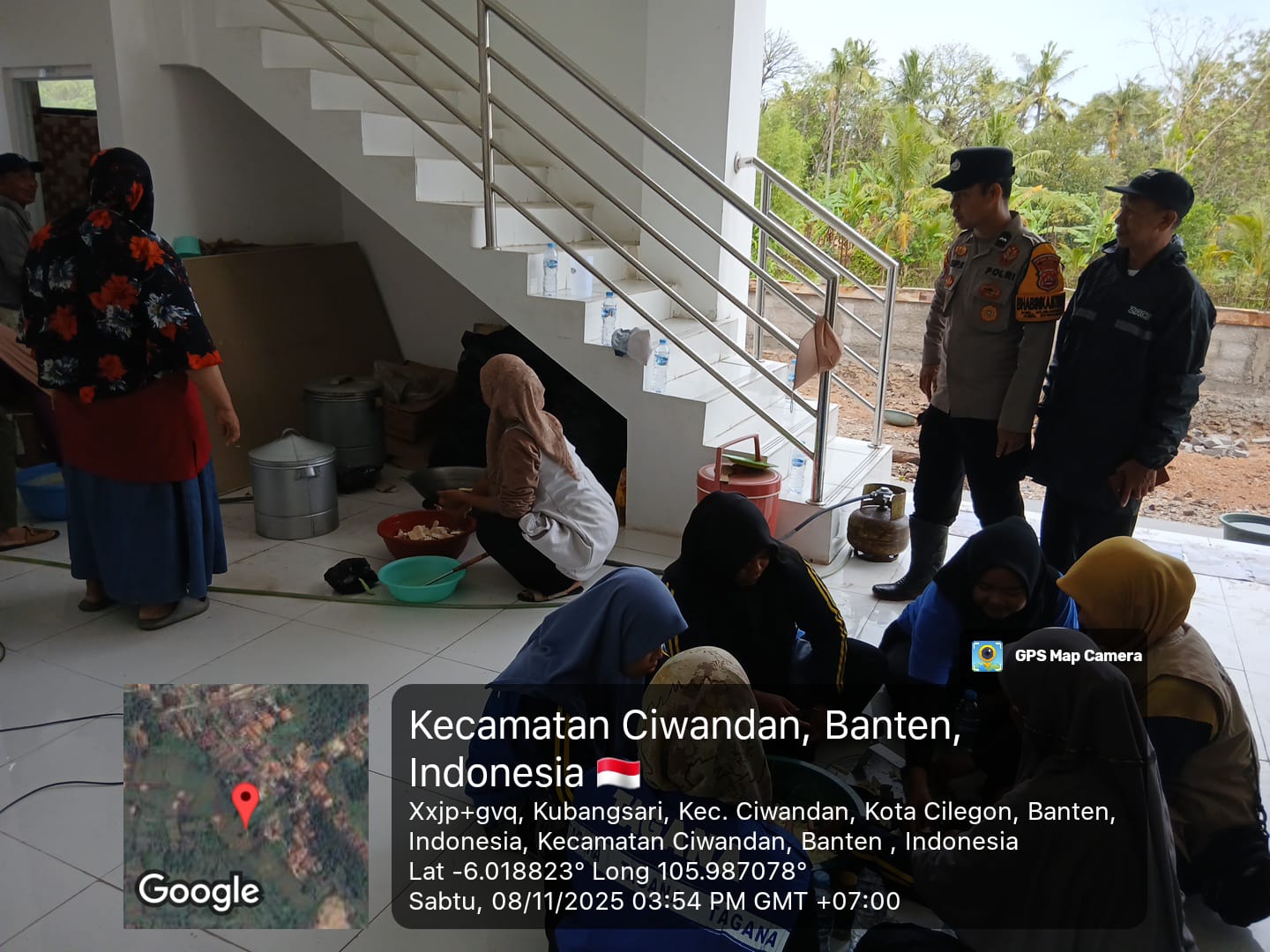 Cilegon - Bhabinkamtibmas Dan Lurah Kubangsari Mengecek Dapur Umum untuk Masyarakat Yang Terdampak Genangan Air pukul 16.07 WIB di lingkungan Cigading pasar Rt 01/02 Kelurahan Kubangsari Kecamatan Ciwandan, Sabtu (08/11/2025).