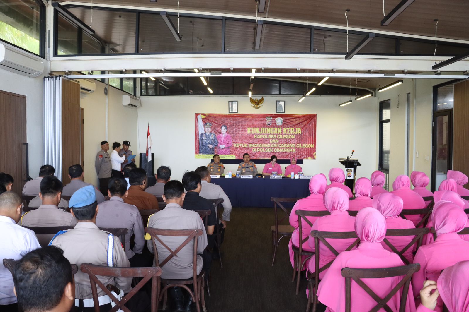 Kegiatan dimulai sekitar pukul 10.40 WIB dengan penyambutan rombongan, dilanjutkan pembukaan, menyanyikan lagu Indonesia Raya, dan pembacaan doa. Dalam kesempatan tersebut, Kapolsek Cinangka IPTU Rusnata menyampaikan ucapan selamat datang kepada Kapolres dan Ketua Bhayangkari Cabang Cilegon beserta jajaran, serta menyampaikan rasa hormat dan terima kasih atas perhatian pimpinan terhadap personel di tingkat Polsek.
