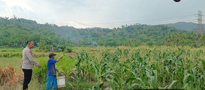 Aipda Anton Sudrajat, Bhabinkamtibmas Kelurahan Pabean, Kecamatan Purwakarta, Kota Cilegon, bersama kelompok tani setempat melakukan pengecekan tanaman jagung di lingkungan Blok Tuk, Karang Tengah