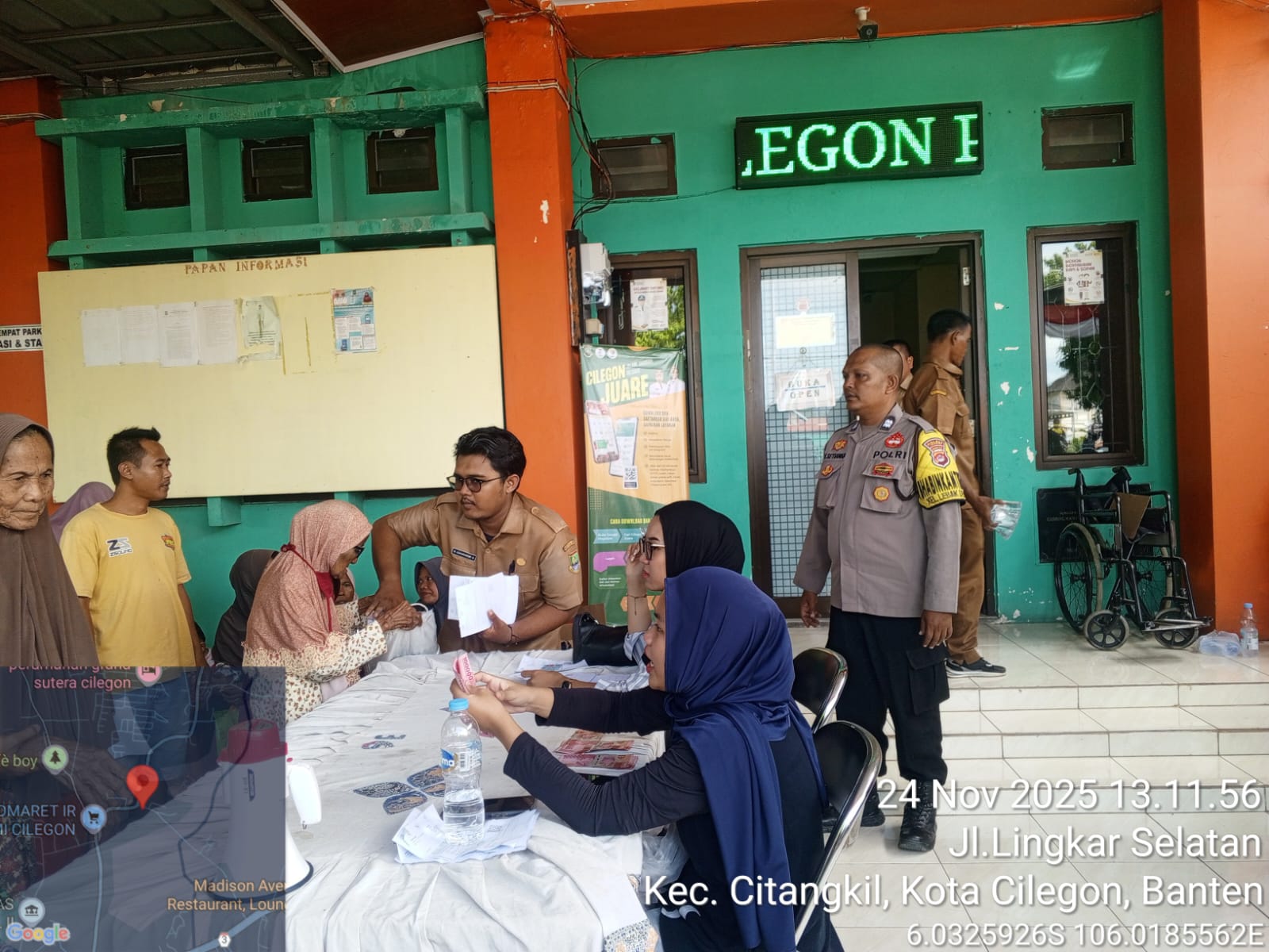 Cilegon - Bhabinkamtibmas Kelurahan Lebak Denok, AIPTU YUDI SETIAWAN, melaksanakan pengamanan dan monitoring bantuan langsung tunai dari Kementerian Sosial RI di Kantor Kelurahan Lebak Denok, Kecamatan Citangkil, Kota Cilegon, Senin (24/11/2025).