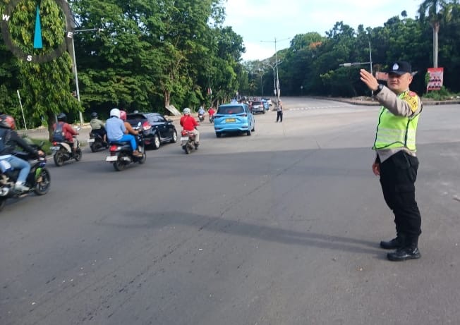 Personil Polsek Purwakarta melaksanakan pengaturan lalu lintas pagi di Simpang ADB Ramanujan untuk memastikan kelancaran arus lalu lintas