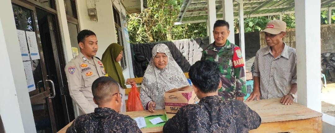 Bhabinkamtibmas Polsek Anyar Polres Cilegon Polda Banten melaksanakan pengamanan Kegiatan Penyaluran bantuan Sembako dari Pemerintah tahun 2023 oleh Pos Indonesia Kec. Anyar, Kamis (27/11).