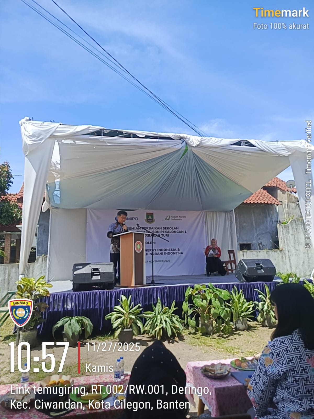 Cilegon - Waka Polsek Ciwandan AKP Uup M. Ma'ruf dan Bhabinkamtibmas Kelurahan Banjarnegara AIPTU Jamaludin menghadiri peresmian perbaikan tiga sekolah dasar—SDN Banjarnegara, SDN Pekalongan 1, dan SDN Babakan Turi—di Halaman SDN Banjarnegara, Link Temugiring, Kel. Banjarnegara, Kec. Ciwandan, Kota Cilegon, Kamis (27/11/2025).