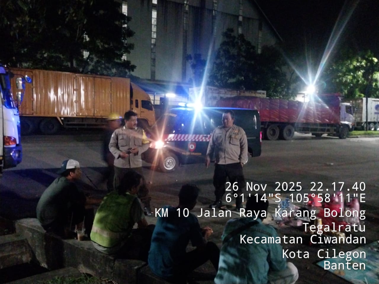 Cilegon - Personil Polsek Ciwandan Polres Cilegon Polda Banten Dalam Pelaksanaan Kegiatan Patroli dengan menyalakan lampu rotator berwarna biru di Daerah Hukum Polsek Ciwandan Polres Cilegon Polda Banten dari malam hingga dini hari, dalam rangka menciptakan situasi aman dan kondusif, Kamis (27/11/2025).