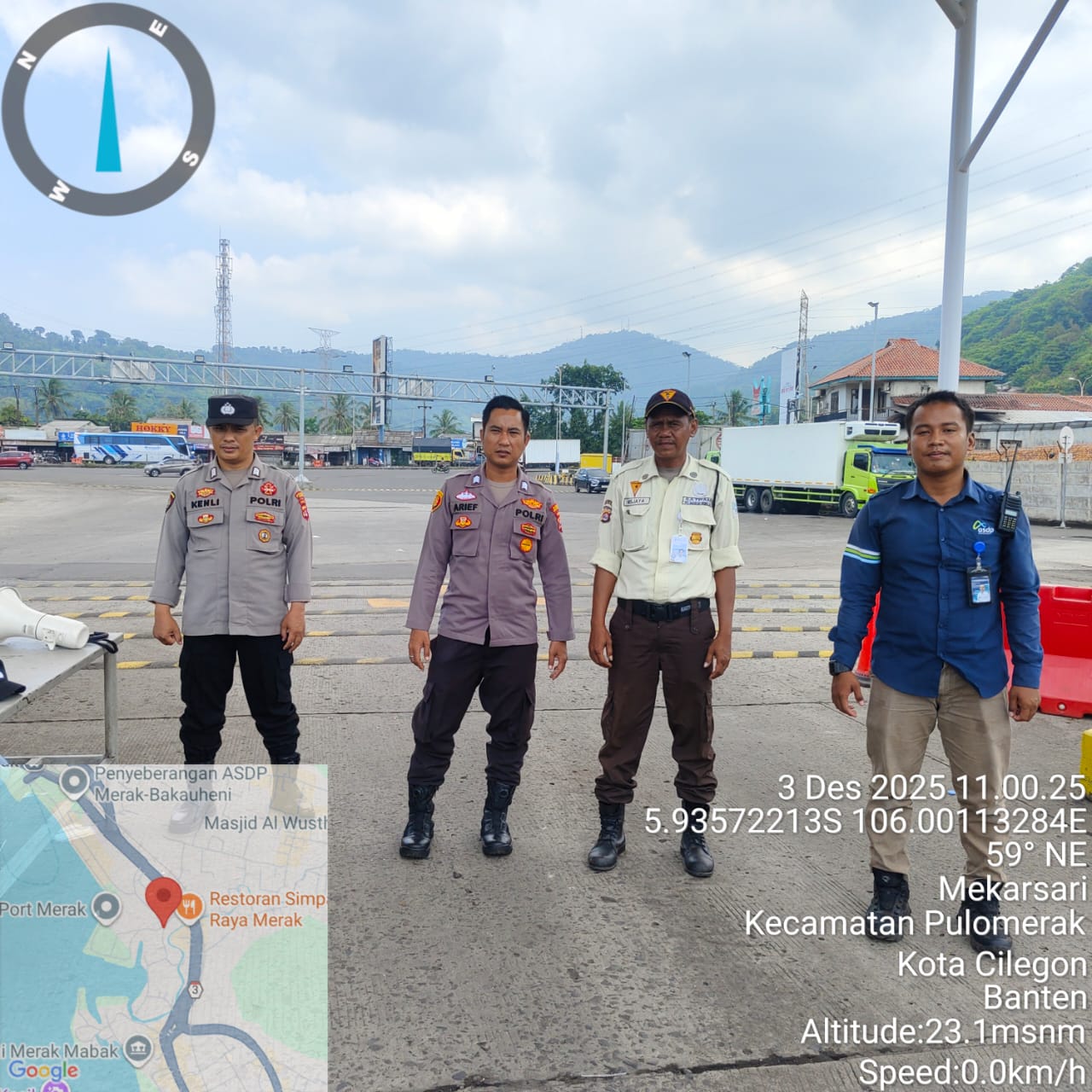 Cilegon - Personel Polsek Kskp Merak Polres Cilegon Polda Banten melaksanakan sambang dan patroli kawasan pelabuhan merak dalam rangka menjaga Harkamtibmas di Kawasan Pelabuhan Merak, Rabu (03/12/2025).