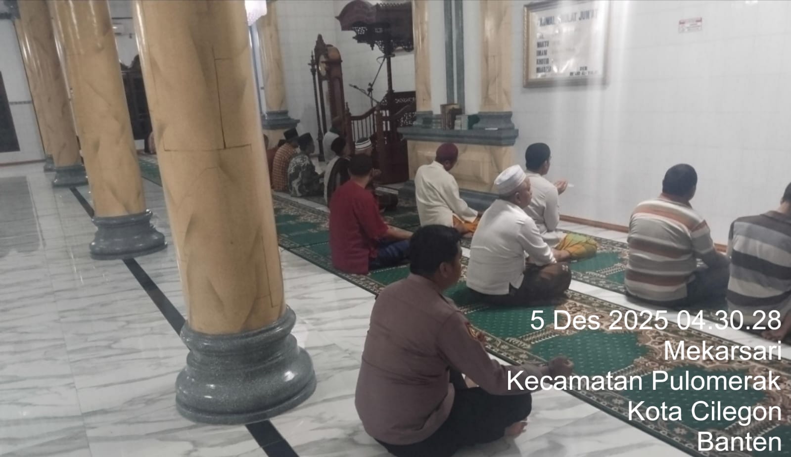 “Dalam kegiatan tersebut, Personil Polsek Kp Polres Cilegon Polda Banten turut berbaur dengan jemaah masjid dalam melaksanakan shalat subuh berjamaah. Setelah itu, dilakukan dialog interaktif antara petugas kepolisian dan masyarakat untuk mendengarkan aspirasi serta memperoleh masukan terkait dengan situasi keamanan dan ketertiban di lingkungan sekitar,” tambah Kapolsek.