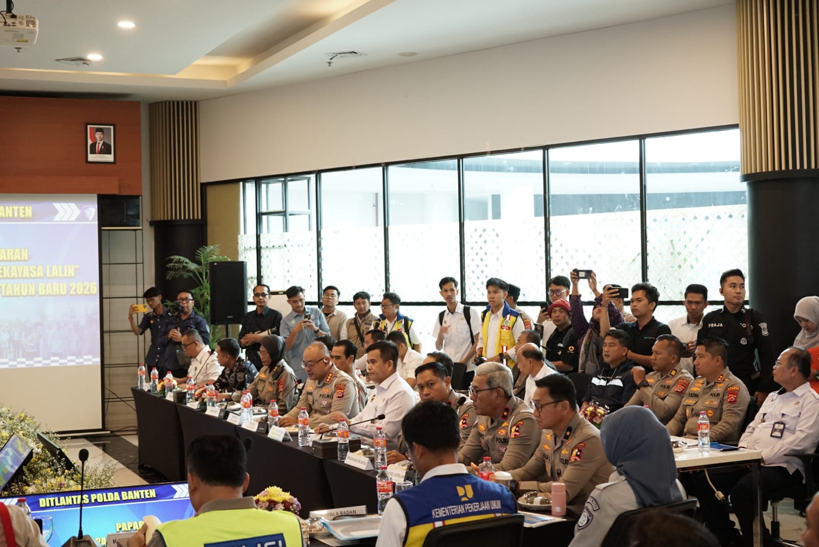 Polda Banten memaparkan kesiapan sarana prasarana, mulai dari Pelabuhan Merak dengan 7 dermaga dan 69 kapal, buffer zone PT Indah Kiat dengan kapasitas lebih dari 2.000 kendaraan kecil, hingga Pelabuhan Ciwandan dan Pelabuhan BBJ sebagai titik pendukung penyeberangan. Sejumlah pola rekayasa lalu lintas turut disiapkan, mulai dari pengalihan arus, delay system KM 43 dan 68, hingga skema satu arah menuju pelabuhan ketika terjadi kepadatan.