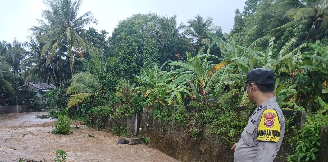 Personel Polsek Anyar Polres Cilegon Polda Banten melaksanakan Patroli kewilayahan mengecek debit air di Sungai pasca Hujan antisipasi banjir di wilayah Kec. Anyar, Selasa (16/12).