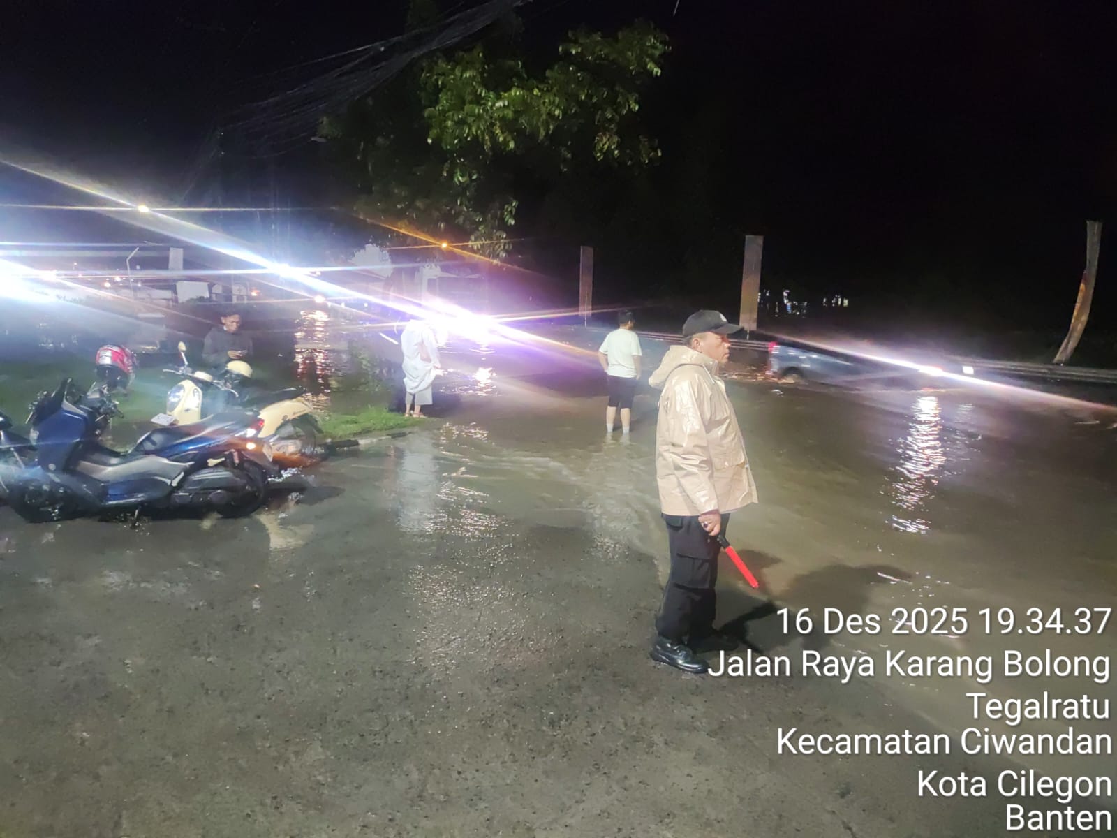 Cilegon - Personil Polsek Ciwandan melaksanakan monitoring genangan air dampak cuaca hujan lebat di wilayah hukum Polsek Ciwandan, Selasa (16/12/2025).