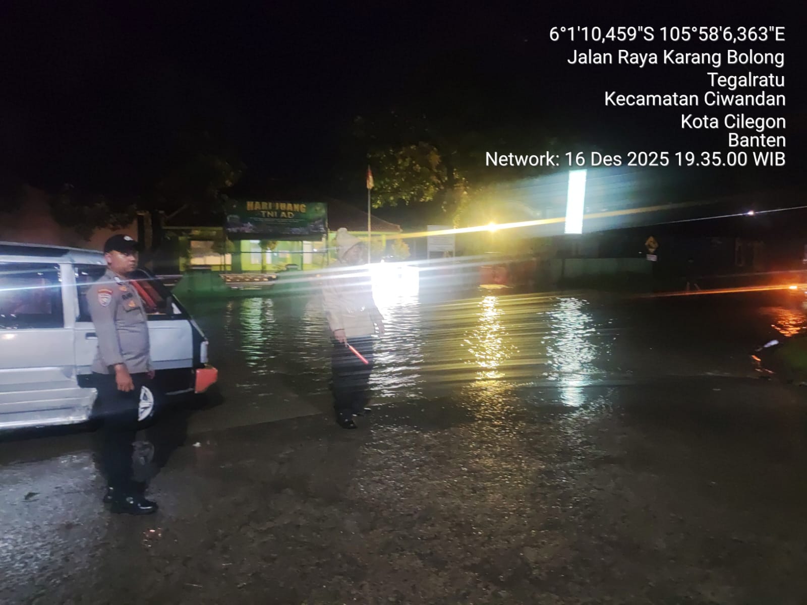 Cilegon - Personil Polsek Ciwandan melaksanakan monitoring genangan air dampak cuaca hujan lebat di wilayah hukum Polsek Ciwandan, Selasa (16/12/2025).