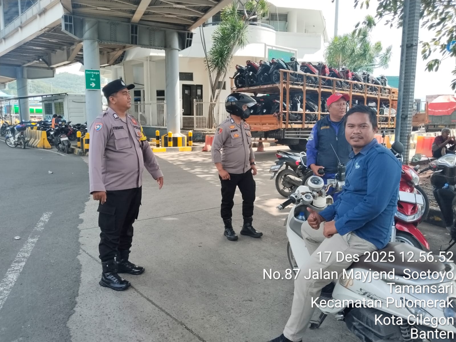 Cilegon - Personel Polsek Kskp Merak Polres Cilegon Polda Banten melaksanakan sambang dan patroli kawasan pelabuhan merak dalam rangka menjaga Harkamtibmas di Kawasan Pelabuhan Merak, Kamis (18/12/2025).