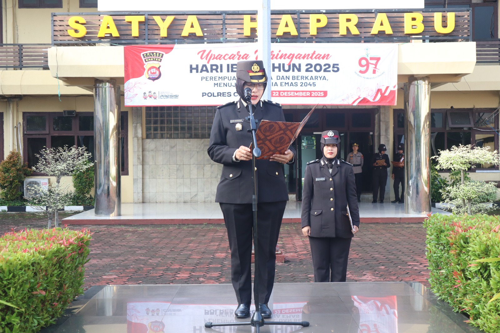 Cilegon Polres Cilegon Polda Banten , pada senin pagi tepatnya 22 Desember 2025 polres cilegon laksanakan Giat Upacara Peringatan Hari Ibu, Dalam suasana yang penuh kehangatan dan kebersamaan, Polres Cilegon merayakan Hari Ibu dengan menggelar upacara peringatan yang berkesan. Uniknya, acara tersebut memiliki sentuhan istimewa karena seluruh perangkat upacara diisi olehSelurtuh Personil polres cilegon baik Polwan Polki Maupun ASN Polres cilegon turut serta menghadiri kegiatan tersebut. Dengan semangat kesetaraan gender, para Anggota polres cilegon khusunya polwasn memimpin prosesi upacara mulai dari pembacaan naskah, pembacaan sejarah hari Ibu, hingga penghormatan kepada ibu-ibu yang hadir.