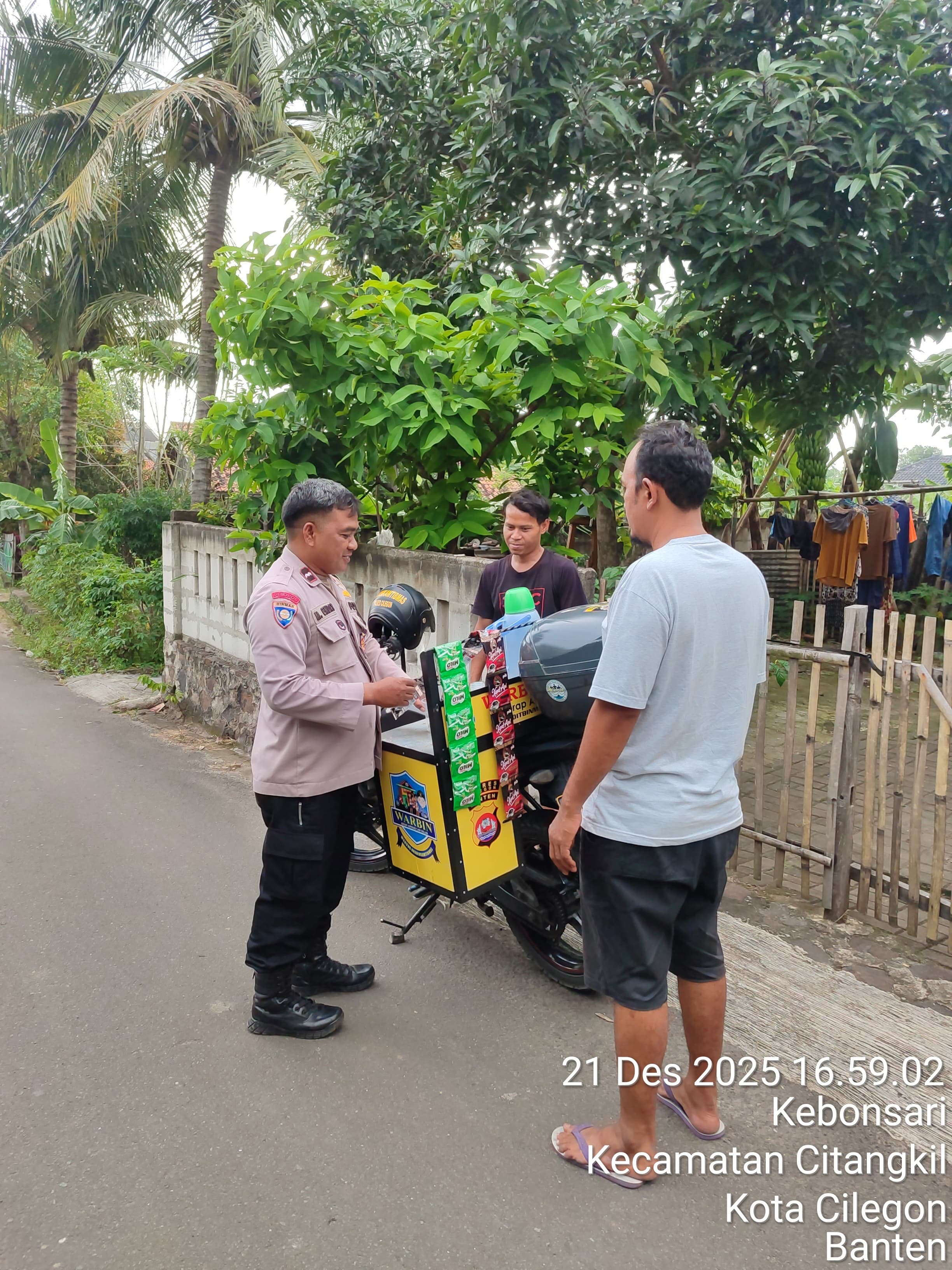 Cilegon - Bhabinkamtibmas Polsek Ciwandan Polres Cilegon Polda Banten melaksanakan kegiatan WARBIN (warung Blnhabinkamtibmas) di Lingkungan Binaan, Minggu (21/12/2025).