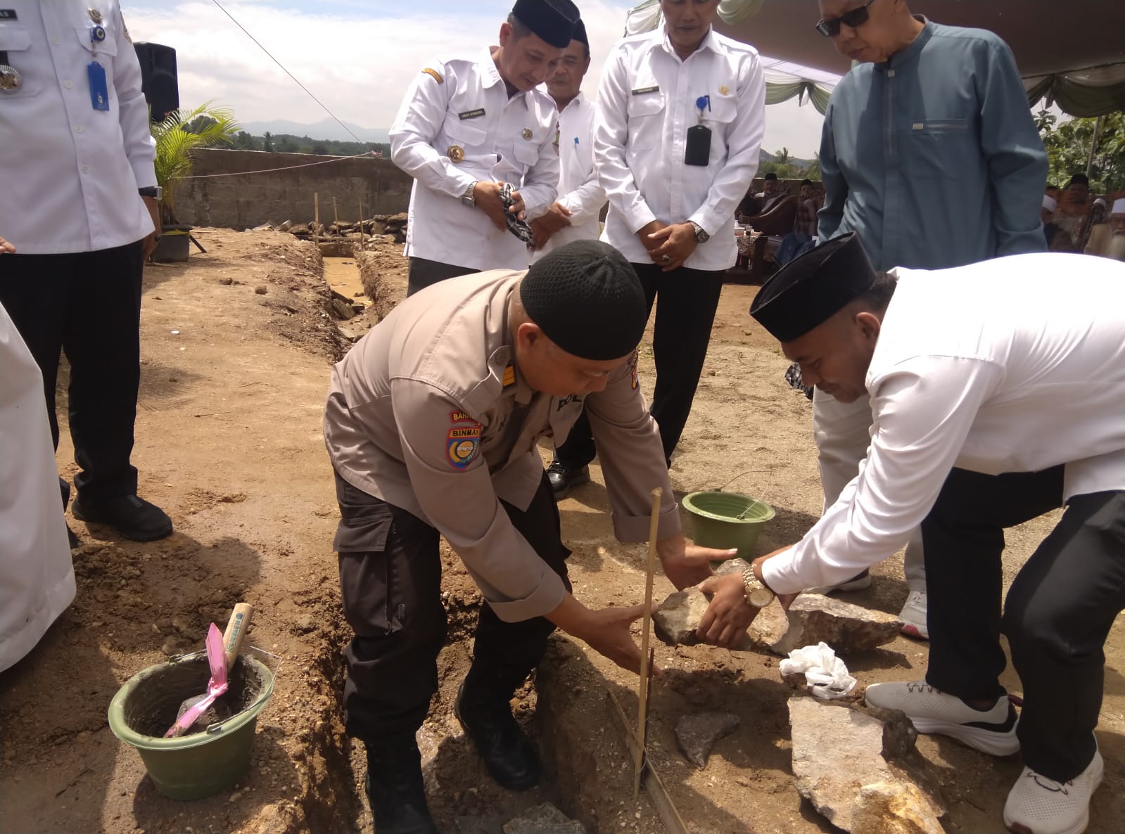 Cilegon - Wakapolsek Ciwandan AKP Uup M Ma'ruf dan personil Polsek Ciwandan hadiri peletakan batu pertama pembangunan Ponpes Roihatul Jannah Banten di Link. Warnasari 2, Kel. Dringo, Citangkil. Kegiatan dihadiri Pemerintah Daerah, TNI Polri, Tokoh Agama, dan Masyarakat,Rabu (24/12/2025).
