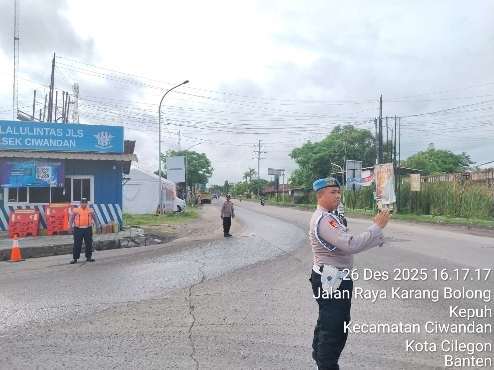 Cilegon - Guna Menciptakan kelancaran arus Mudik Natal tahun 2025 Dan Tahun Baru 2026 yang menuju Pelabuhan Pelindo Dan jalur wisata yang ada di daerah hukum Polsek Ciwandan Polres Cilegon Polda Banten,Pospam 5 Ciwandan berlakukan rekayasa Lalu lintas, Jum'at (26/12/2025).