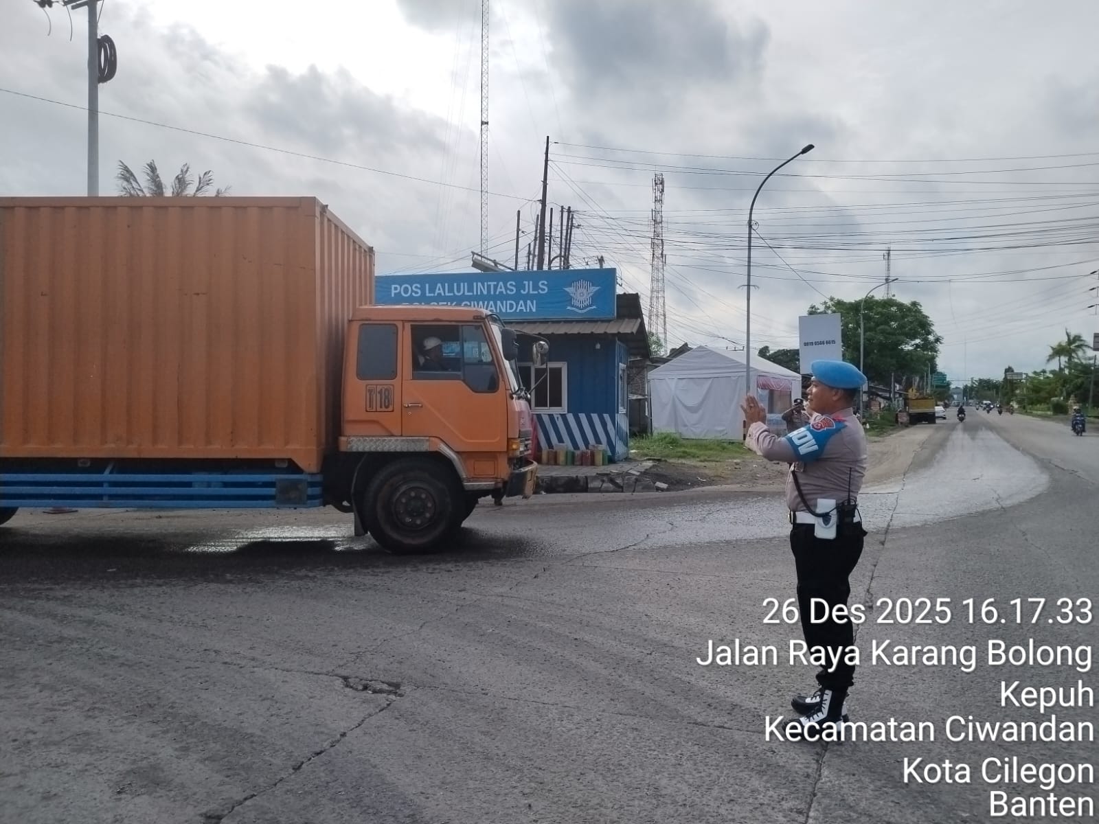 Cilegon - Guna Menciptakan kelancaran arus Mudik Natal tahun 2025 Dan Tahun Baru 2026 yang menuju Pelabuhan Pelindo Dan jalur wisata yang ada di daerah hukum Polsek Ciwandan Polres Cilegon Polda Banten,Pospam 5 Ciwandan berlakukan rekayasa Lalu lintas, Jum'at (26/12/2025).