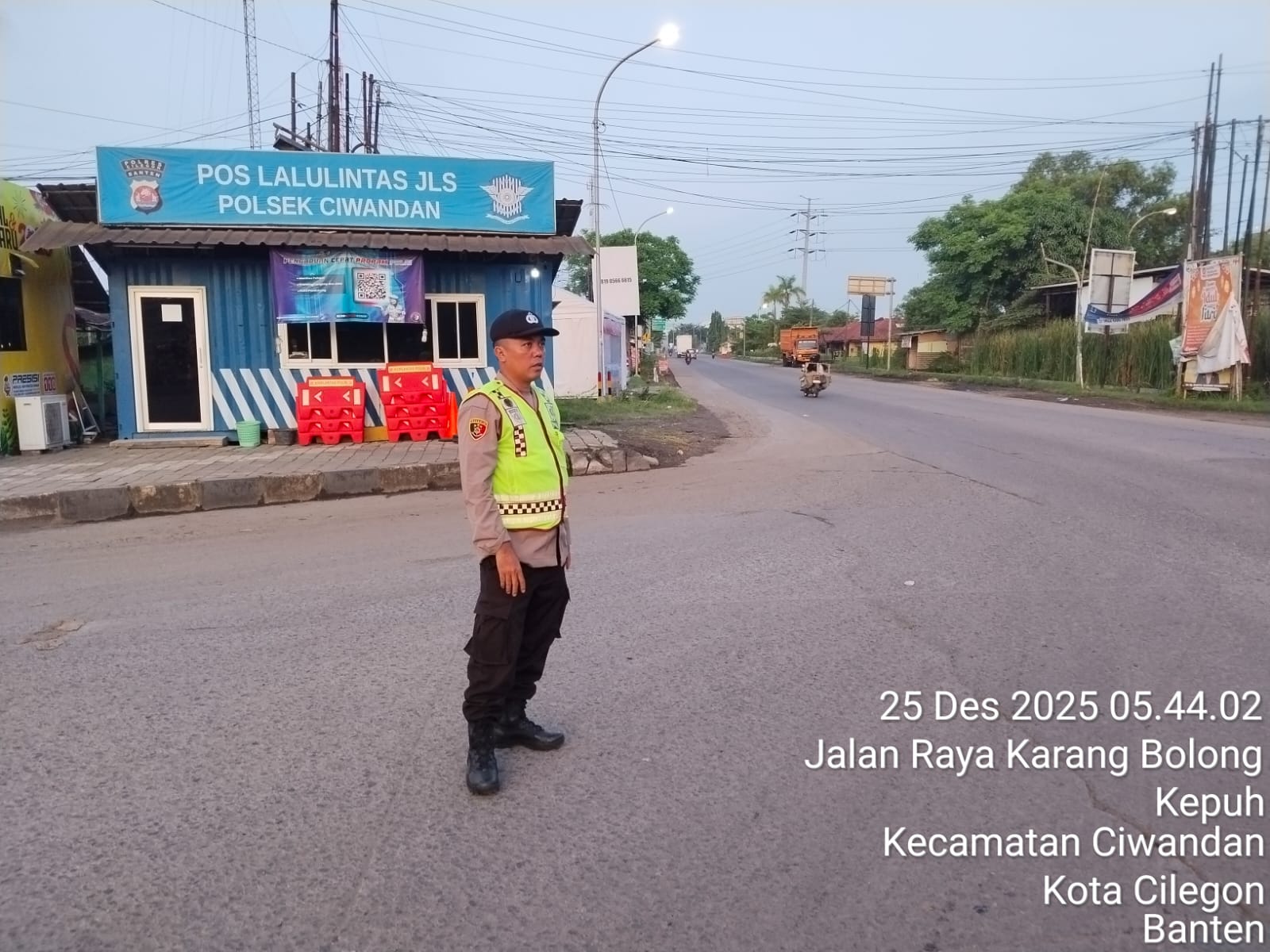 Cilegon - Guna Menciptakan kelancaran arus Mudik Natal tahun 2025 Dan Tahun Baru 2026 yang menuju Pelabuhan Pelindo Dan jalur wisata yang ada di daerah hukum Polsek Ciwandan Polres Cilegon Polda Banten,Pospam 5 Ciwandan berlakukan rekayasa Lalu lintas, Jum'at (26/12/2025).