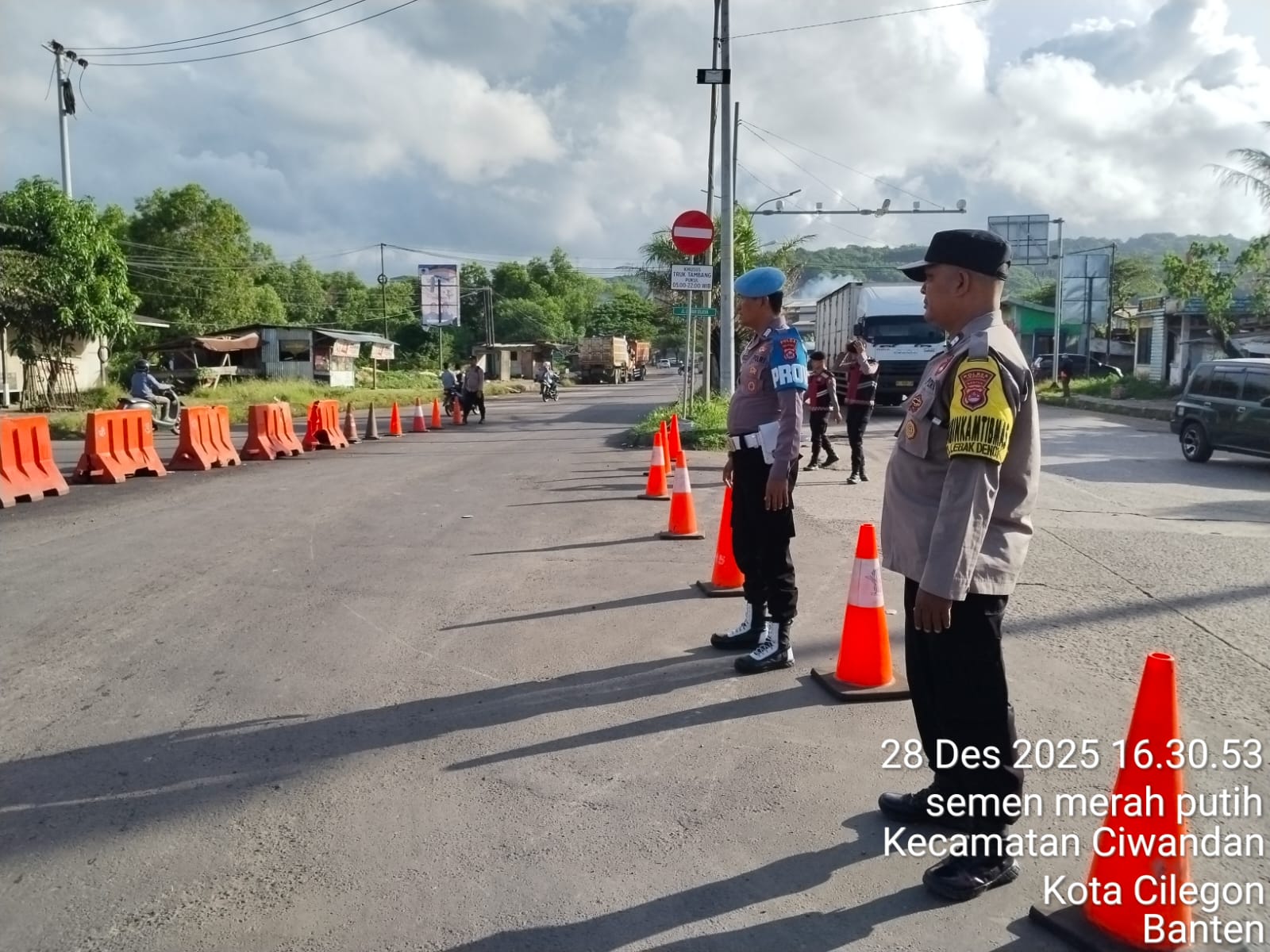 Cilegon - Guna Menciptakan kelancaran arus Lalu-Lintas Perayaan Natal Dan Tahun Baru menuju jalur wisata Anyer-Cinagka yang ada di daerah hukum Polsek Ciwandan Polres Cilegon Polda Banten,Pospam 5 Ciwandan berlakukan rekayasa Lalu lintas, Minggu (28/12/2025).