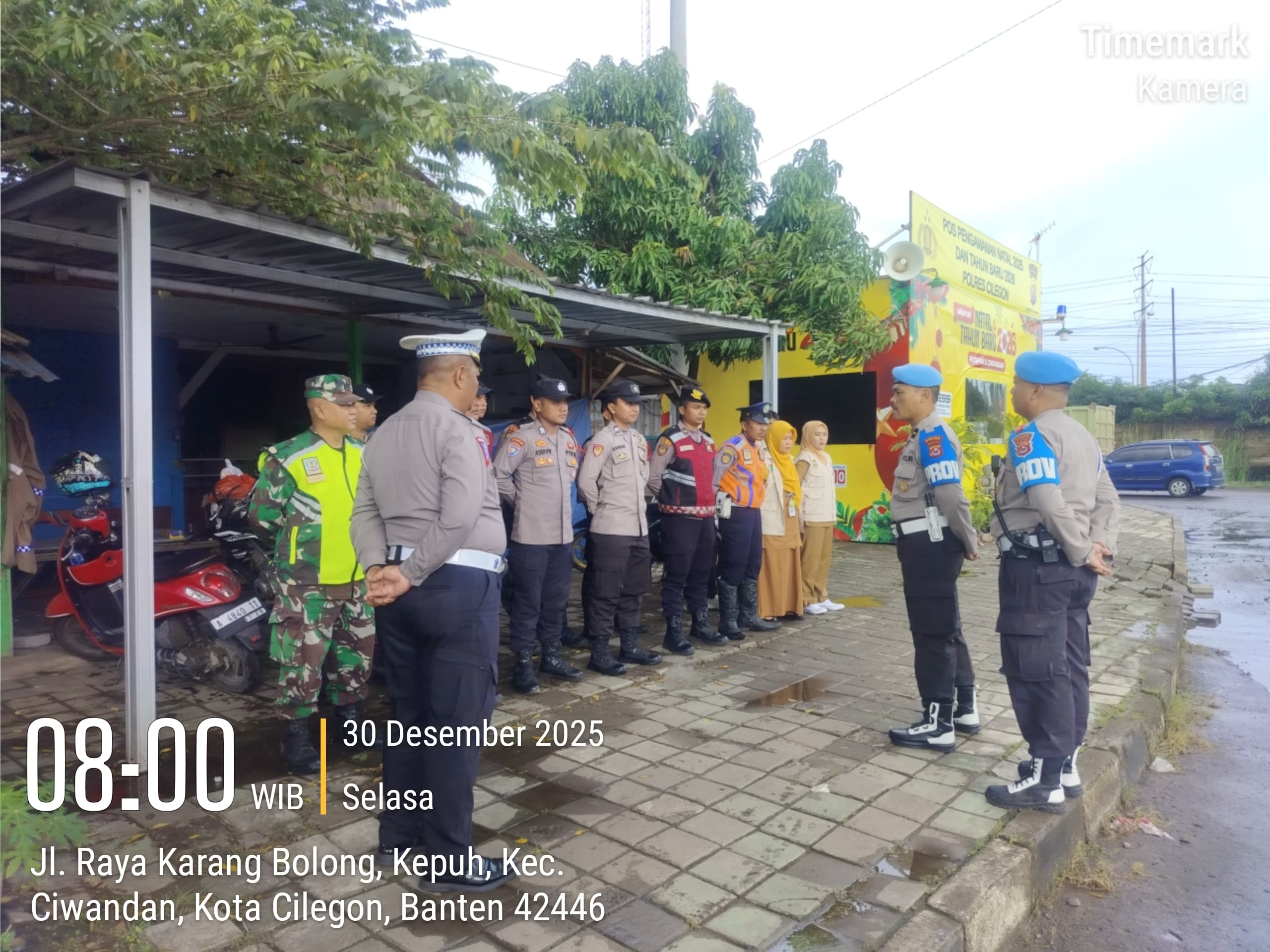 Cilegon - Personil Pospam 5 Ciwandan Polsek Ciwandan Polres Cilegon Polda Banten melaksanakan Apel Kesiapan Pelaksanaan kegiatan pengamanan Arus Lalu-lintas Wisata Dalan Operasi Lilin Maung 2025, Selasa (30/12/2025).