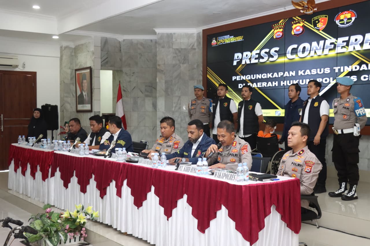 Press conference tersebut disampaikan oleh Ditreskrimum Polda Banten Kombes Pol Dian Setyawan didampingi Kapolres Cilegon AKBP Dr. Martua Raja Taripar Laut Silitonga, Plh. Kabid Humas Polda Banten AKBP Meryadi, Wakapolres Cilegon Kompol Arief Nazarudin, Kasubdit Jatanran Ditreskrimum Polda Banten Kompol Yeremia Iwo, Kasat Reskrim Polres Cilegon AKP Yoga Tama, Ka Instalasi Forensik Modikolegal RSUD Cilegon Dr. Baeti Adhayati SP FM, Puslabfor Polri Kompol Irfan Rofik.