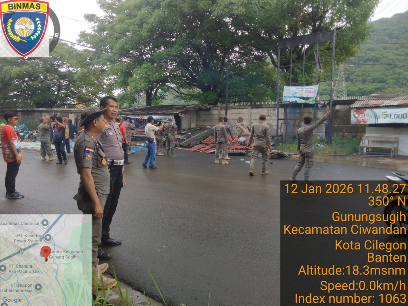 Cilegon - Personil Polsek Ciwandan Polres Cilegon Polda Banten melakukan pengawasan pembongkaran bangunan liar di atas tandon di Jl. Sunan Kali Jaga, Kelurahan Gunung Sugih, Kecamatan Ciwandan, Kota Cilegon. Senin (12/01/2026).