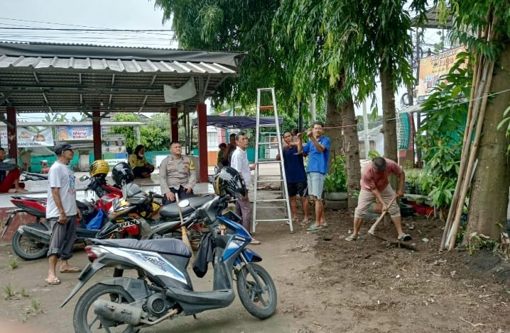 cegah genangan air,polisi dan warga kebondalem bersihkan drainase di pos ronda rama baru