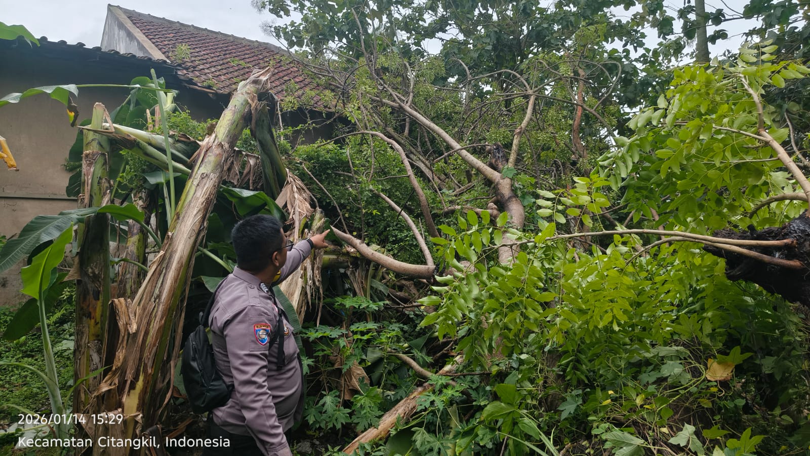 Cilegon - Bhabinkamtibmas Kelurahan Samangraya BRIPKA Marisco bersama Tagana Kota Cilegon dan perangkat RW dan RT, membantu membersihkan area rumah Sdri. IIN yang tertimpa pohon tumbang di Link. Kubang Welut Rt 06/04 Kel. Samangraya. Kamis (15/01/2026).