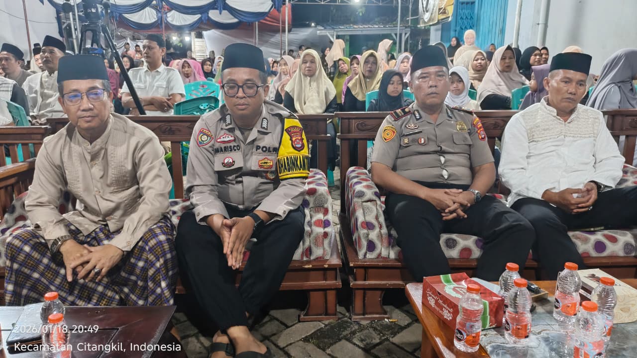 Kegiatan ini berlangsung dalam acara Peringatan Isro Miraj, dihadiri Camat Citangkil, Plt Lurah Samangraya, dan tokoh masyarakat. IPTU Ali Asron memberikan himbauan terkait harkamtibmas, ITE, pencegahan narkoba, dan layanan 110. Situasi aman dan tertib.