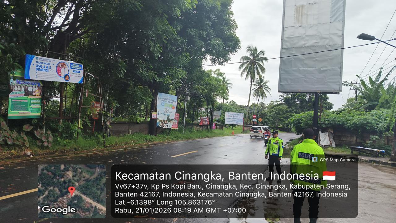 *Polres Cilegon* - Dalam Mewujudkan Aksi Nyata Pelayanan Kepada Masyarakat,Personil Polsek Cinangka Polres Cilegon Polda Banten Laksanakan Strong Poin Pengaturan Lalu-lintas, Kamis  (22/01/2026).