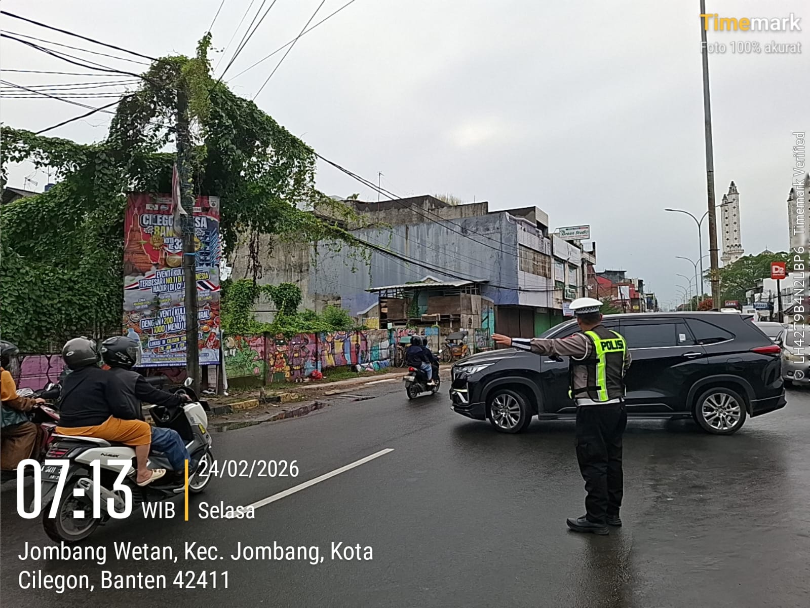 Cilegon, Satlantas Polres Cilegon Polda Banten – Berikan pelayanan kepada masyarakat Kasat lantas Polres Cilegon AKP Ridwan memerintahkan jajaran lalulintas untuk melaksanakan pengaturan lalu lintas di penggal – penggal jalan yang rawan kemacetan di Kota Cilegon, (Selasa,24/2/2026)